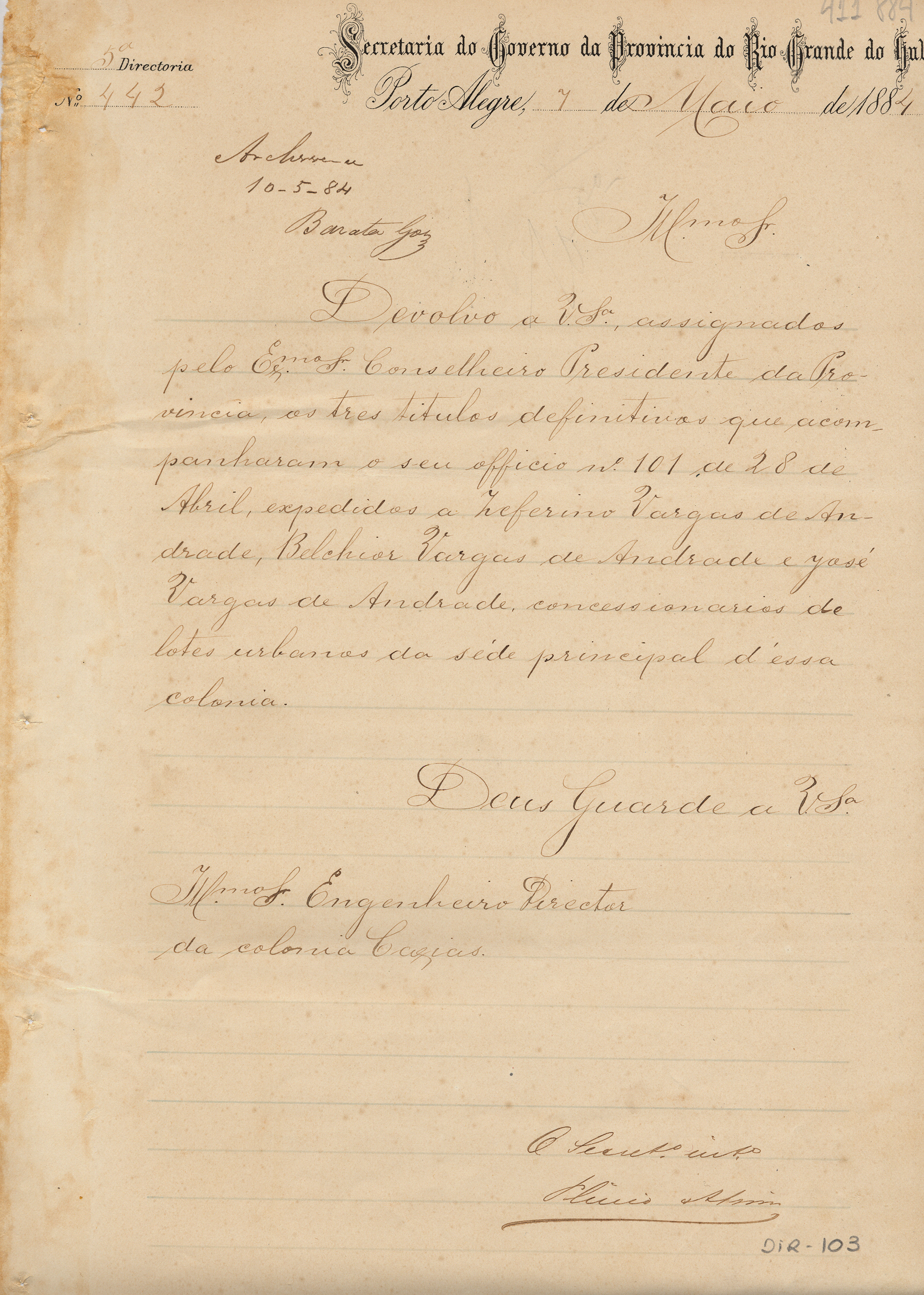 Da Secretaria do Governo da Província do RS - 5ª Diretoria - Plínio Almeida - Secretário interino, para o Engenheiro Diretor da Colônia Caxias. Assunto: comunica devolução de títulos definitivos de lotes urbanos concedidos à Zeferino Vargas de Andrade e José Vargas de Andrade. Local: Porto Alegre.