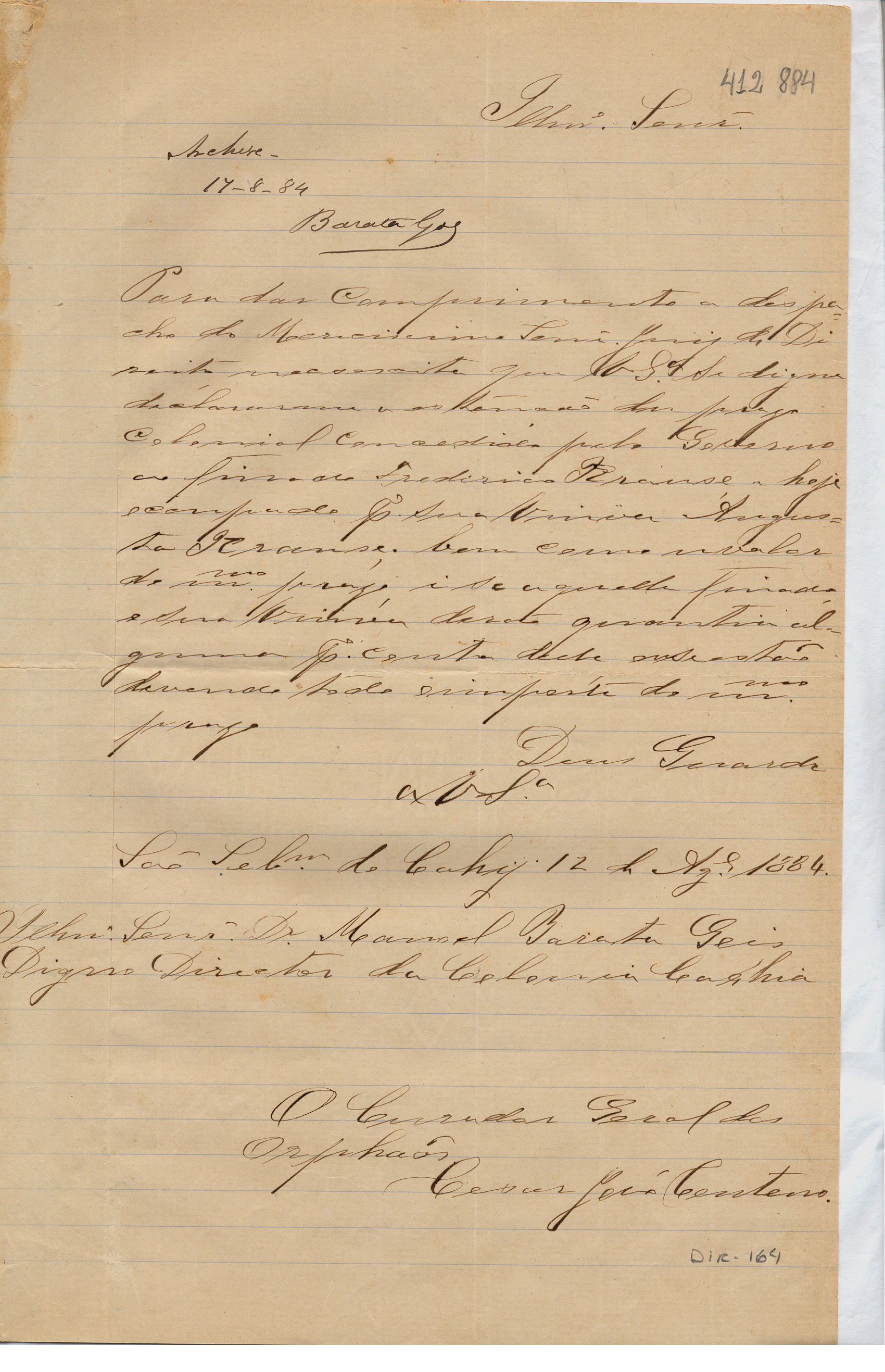 Do Juizo de Direito de São Sebastião do Caí - Cesar José Centeno - Curador Geral dos órfãos, para o Dr. Manoel Barata Góes - Diretor da Colônia Caxias. Assunto: pagamento de terras pela viúva Augusta Krause.