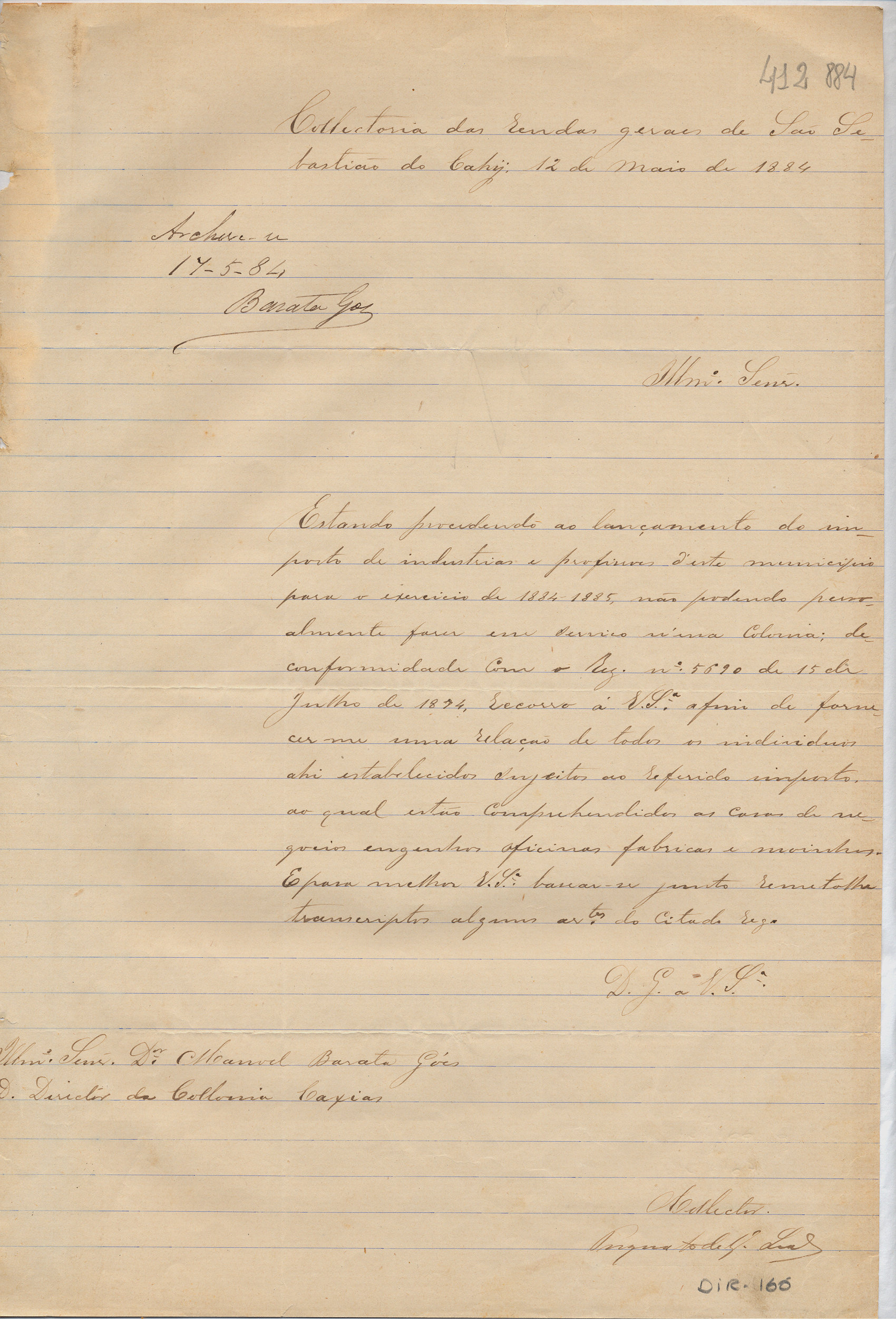 Da Coletoria das Rendas Gerais em São Sebastião do Caí - Coletor, para o Dr. Manoel Barata Góes - Diretor da Colônia Caxias. Assunto: solicitação de relação dos indivíduos estabelecidos na colônia, sujeitos ao imposto de indústria e profissões.