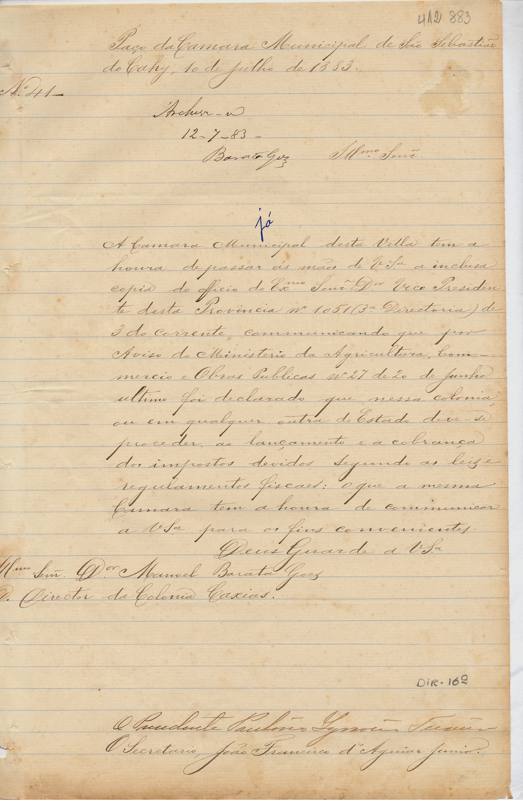 Da Câmara Municipal de São Sebastião do Caí - Paulino Ignacio Teixeira - Presidente e João Francisco d'Aguiar Jr. - Secretário, para Dr. Manoel Barata Góes - Diretor da Colônia Caxias. Assunto: informa procedimentos para cobrança de impostos. DIR 169