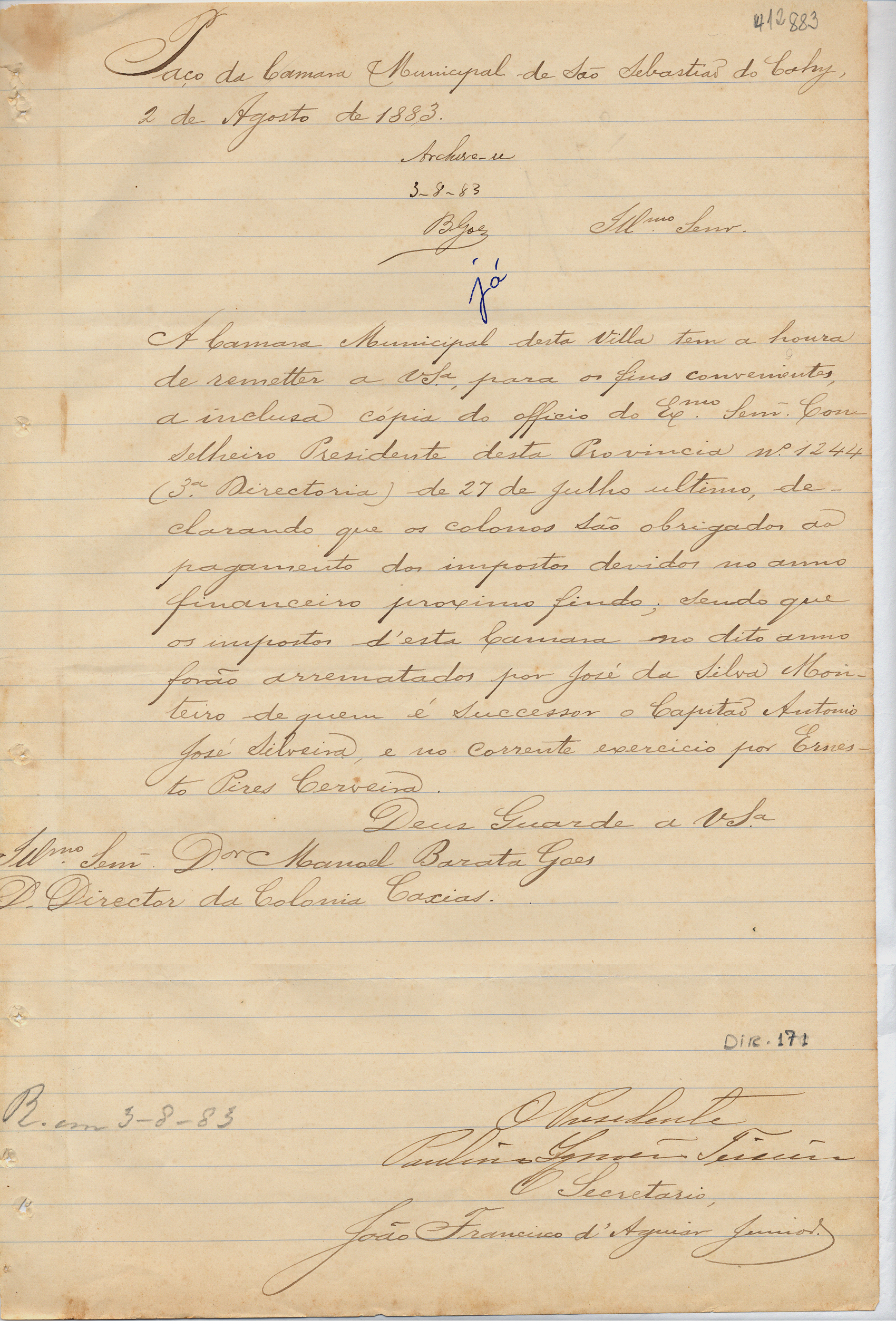 Da Câmara Municipal de São Sebastião do Caí - Paulino Ignacio Teixeira - Presidente e João Francisco d'Aguiar Jr. - Secretário, para Dr. Manoel Barata Góes - Diretor da Colônia Caxias. Assunto: declara obrigação dos colonos a pagarem os impostos devidos.