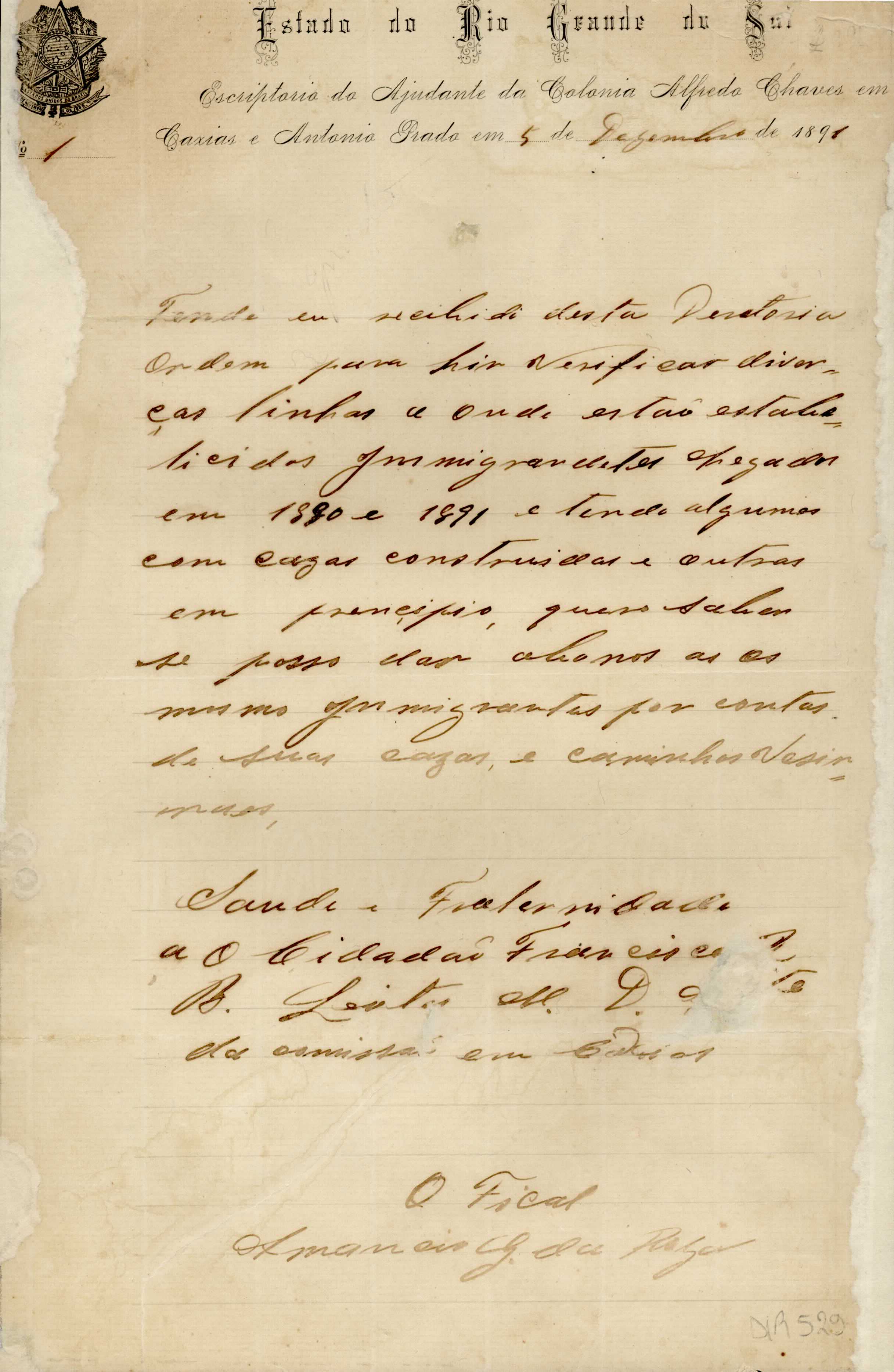 De Amancio G. da Rosa - Fiscal - Escritório do Ajudante da Colônia Alfredo Chaves em Caxias e Antônio Prado, para Francisco C. R. B. Leite - Ajudante da Comissão em Caxias. Assunto: solicita informações sobre pagamento de abono aos imigrantes.