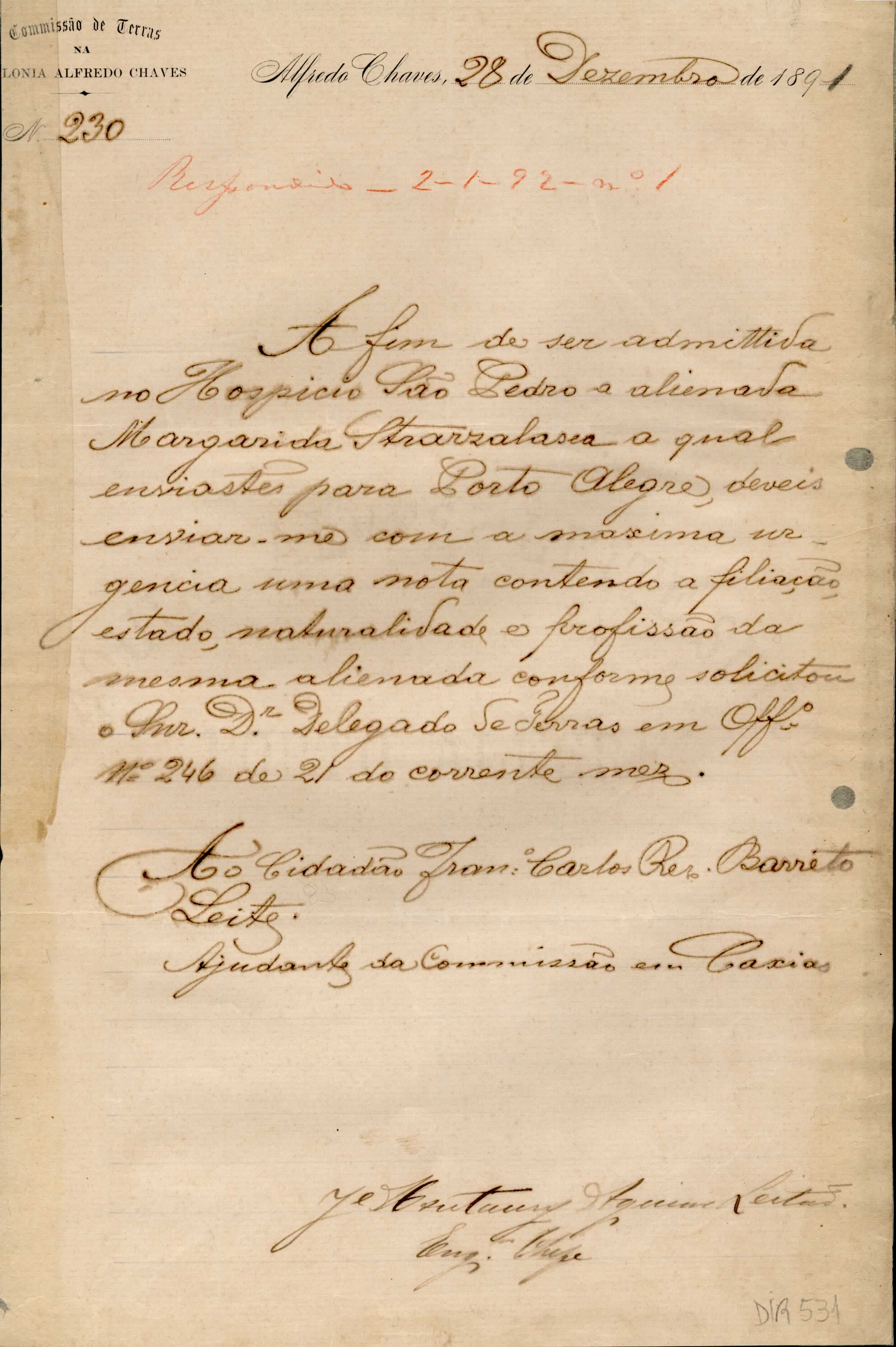 De José Montaury Aguiar Leitão - Engenheiro Chefe da comissão de Terras em Alfredo Chaves para Francisco C. R. B. Leite - Ajudante da Comissão de Terras em Caxias e Antônio Prado. Assunto: solicita informações de Margarida Strarzalasca, para internação no Hospício São Pedro. DIR 531