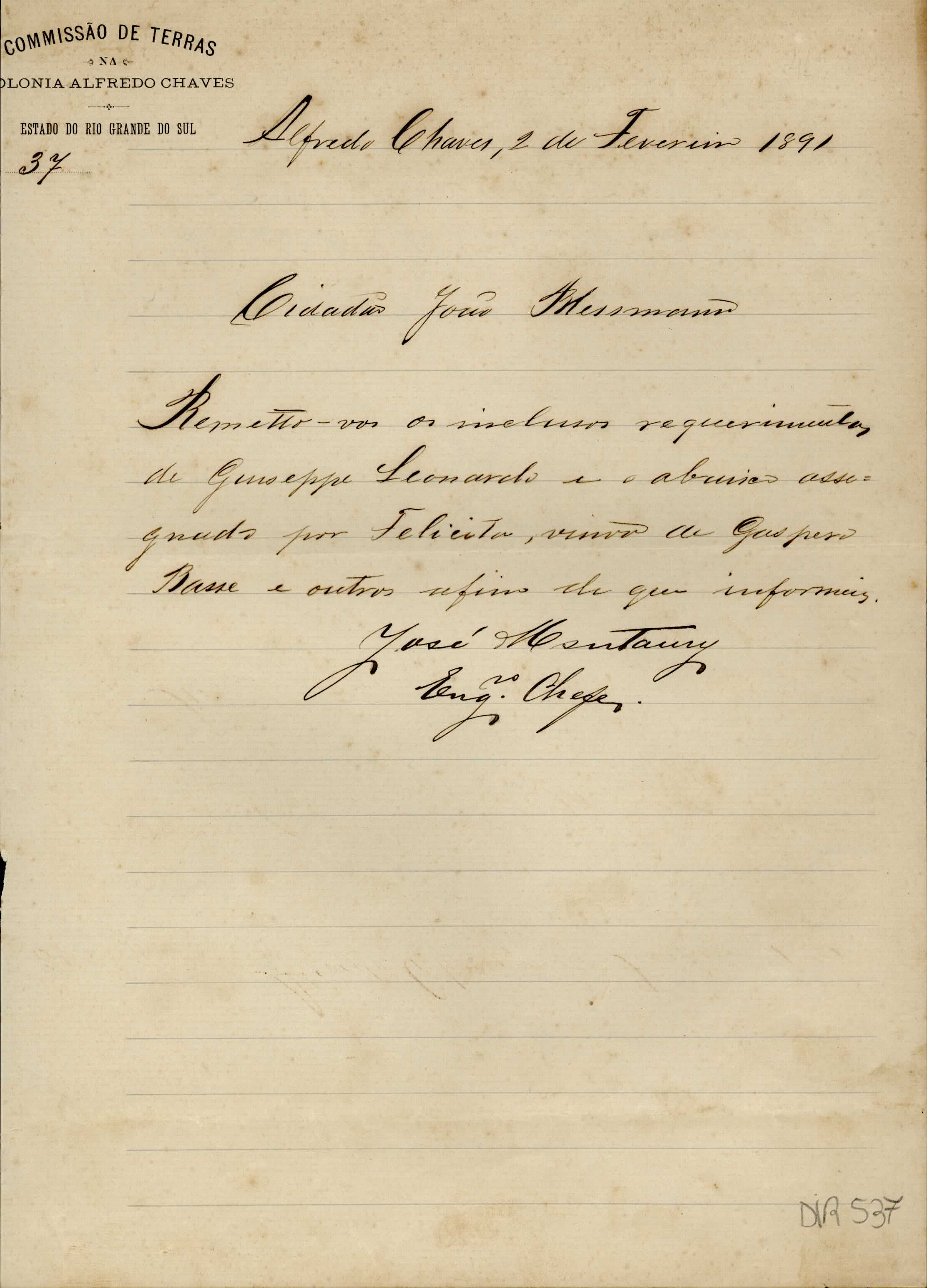 De José Montaury Aguiar Leitão - Engenheiro Chefe da Comissão de Terras em Alfredo Chaves para João Blessmann - Agrimensor da colônia Alfredo Chaves em Caxias. Assunto: comunica remessa de requerimento de Giuseppe Leonardo e de um abaixo assinado.