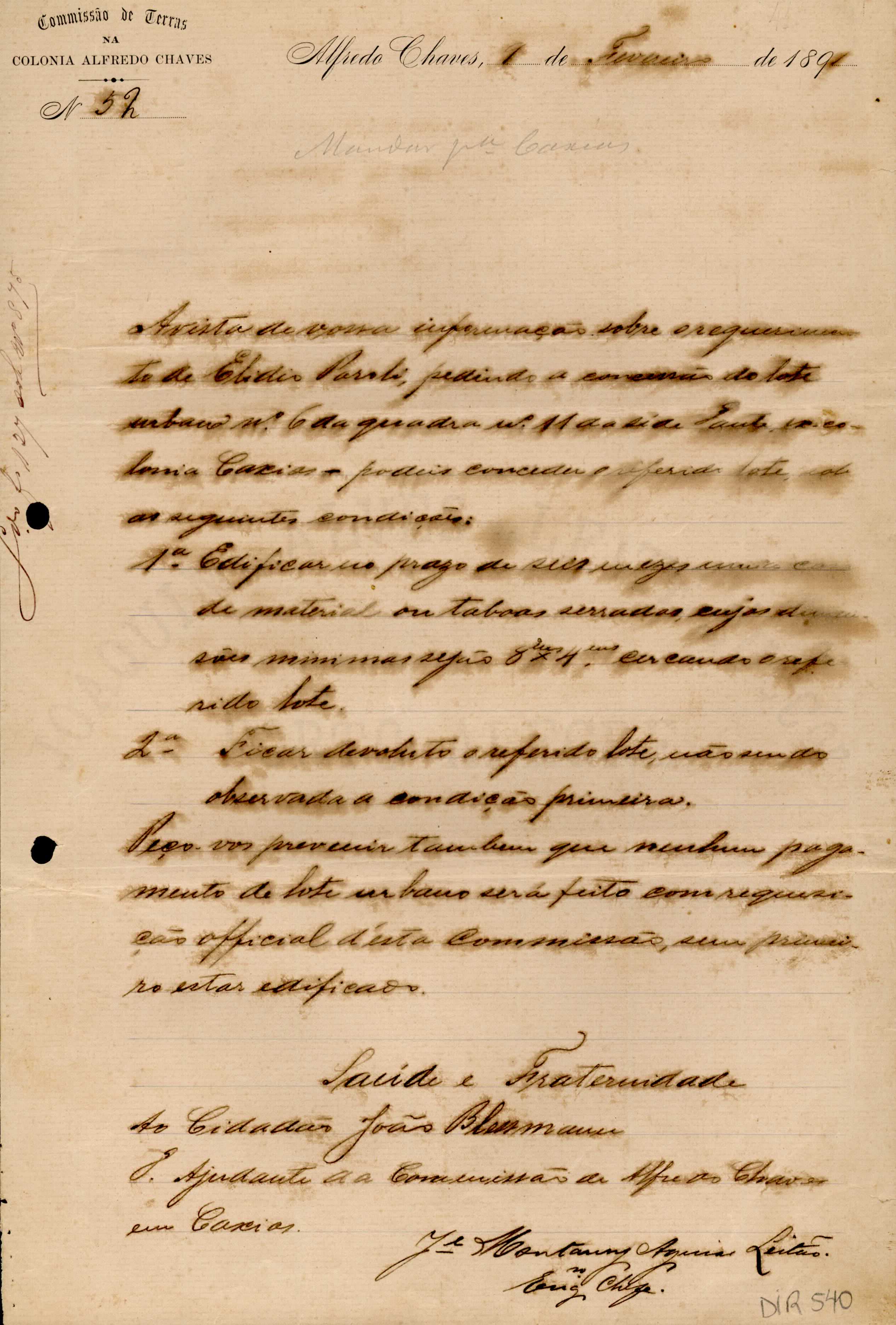 De José Montaury Aguiar Leitão - Engenheiro Chefe da comissão de Terras em Alfredo Chaves, para João Blessmann - Ajudante da Comissão de Alfredo chaves em Caxias. Assunto: concede o lote urbano n.º 06 da quadra n.º 11da sede Dante para Elidio Paroli, mediante condições.
