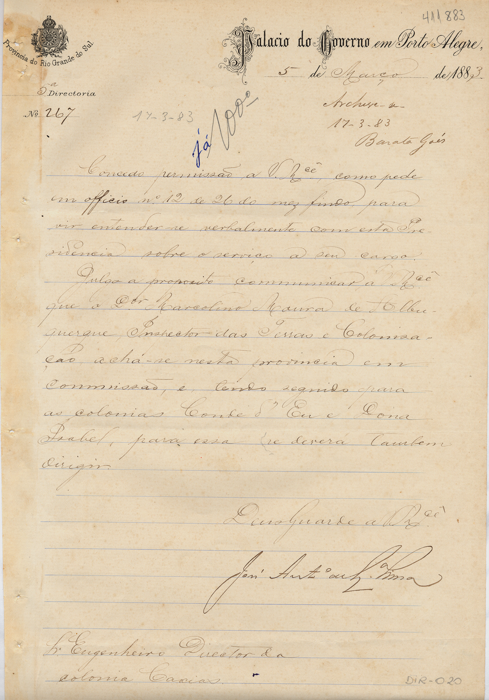 Do Palácio do Governo - 5ª Diretoria - Sr. José Antonio de S. Lima, para o Engenheiro Diretor da Colônia Caxias. Assunto: permissão ao funcionário da Diretoria para entender-se pessoalmente com a Presidência sobre seu serviço; informa que o Inspetor de Terras e Colonização, Dr. Marcolino Moura de Albuquerque encontra-se na Província. Local: Porto Alegre.
