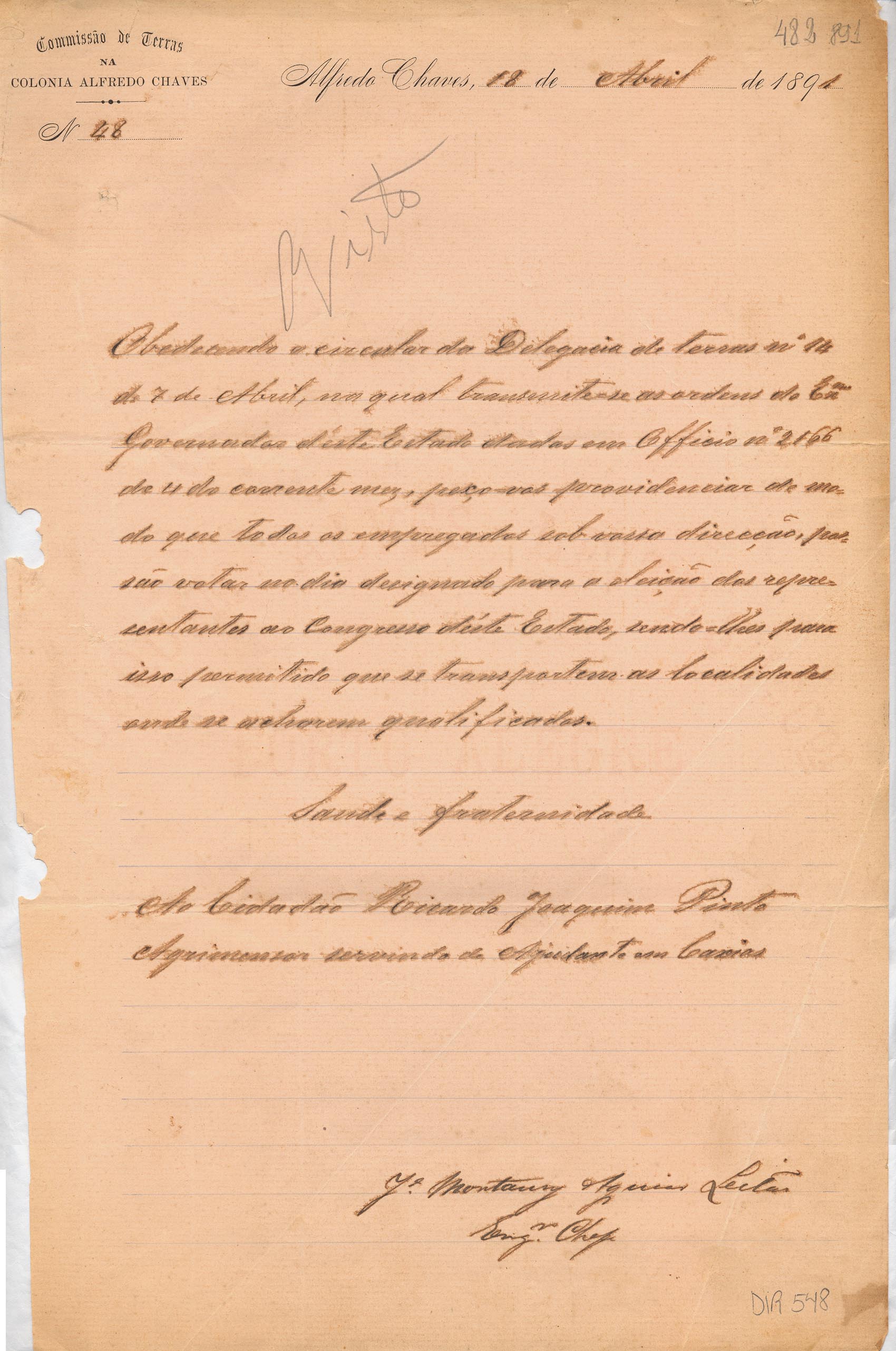De José Montaury Aguiar Leitão - Engenheiro Chefe da Comissão de Terras em Alfredo Chaves para Ricardo Joaquim Pinto - Agrimensor Ajudante da Comissão em Caxias. Assunto: solicita liberação dos empregados para votarem na eleição para representantes do Congresso do Estado.