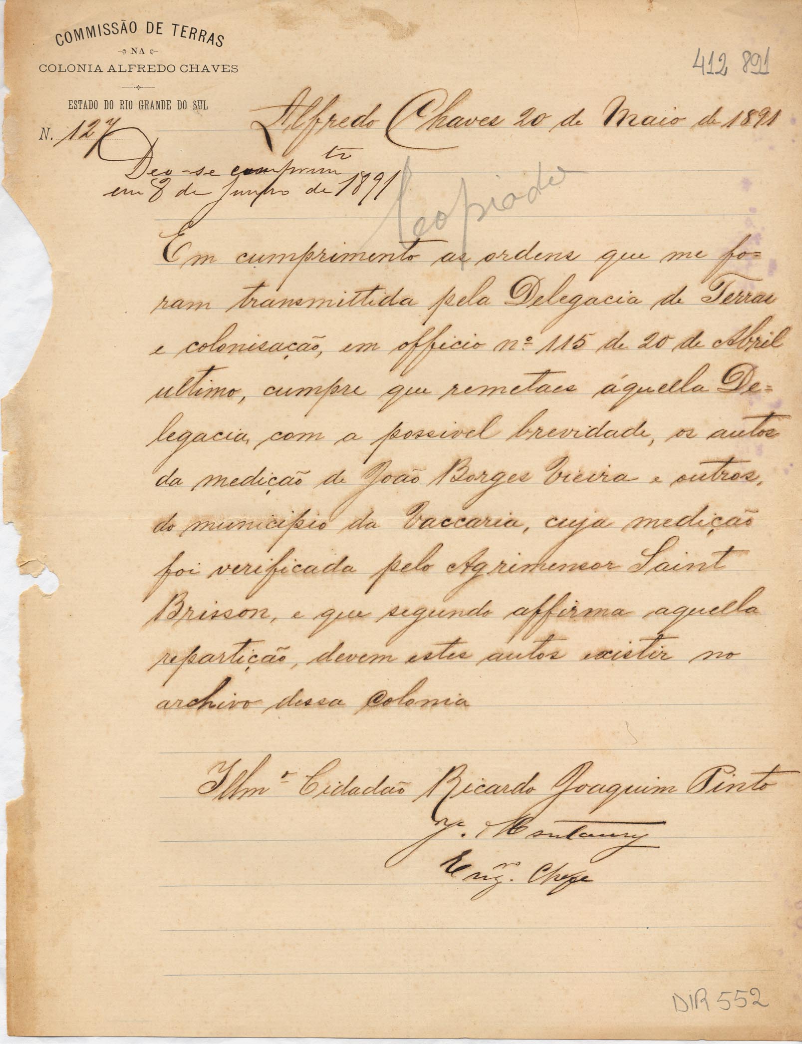 De José Montaury Aguiar Leitão - Engenheiro Chefe da Comissão de Terras em Alfredo Chaves para Ricardo Joaquim Pinto - Agrimensor Ajudante da Comissão, em Caxias. Assunto: solicita remessa de autos da medição de João Borges Vieira e outros do município de Vacaria, para a Delegacia de Terras e Colonização.