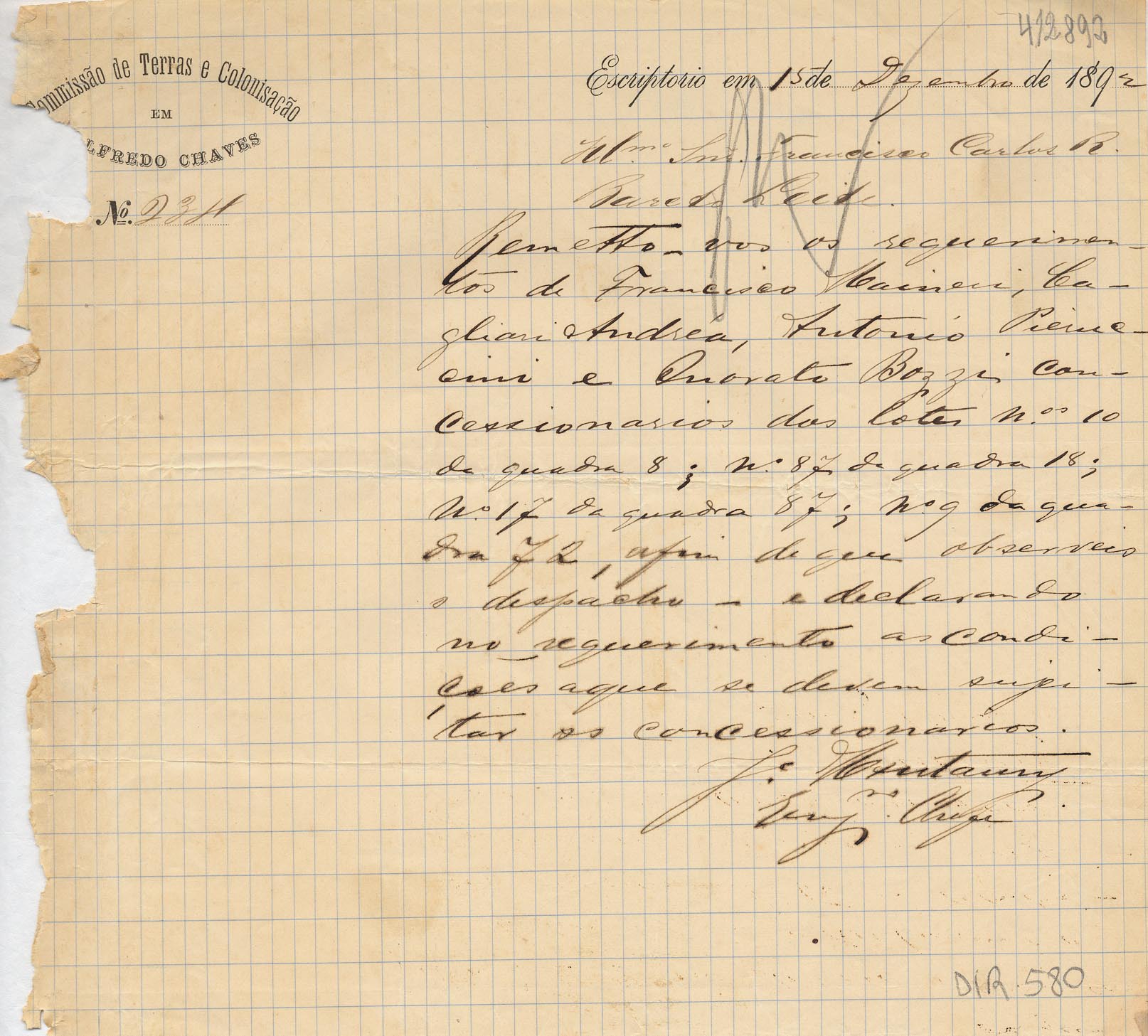 De José Montaury Aguiar Leitão - Engenheiro Chefe da Comissão de Terras em Alfredo Chaves, para Francisco C. R. B. Leite - Ajudante da Comissão em Caxias. Assunto: comunica remessa dos requerimentos de Francisco Maineri, Cagliari Andréa, Antonio Pierucini e Onorato Bozzi, concessionários de lotes.