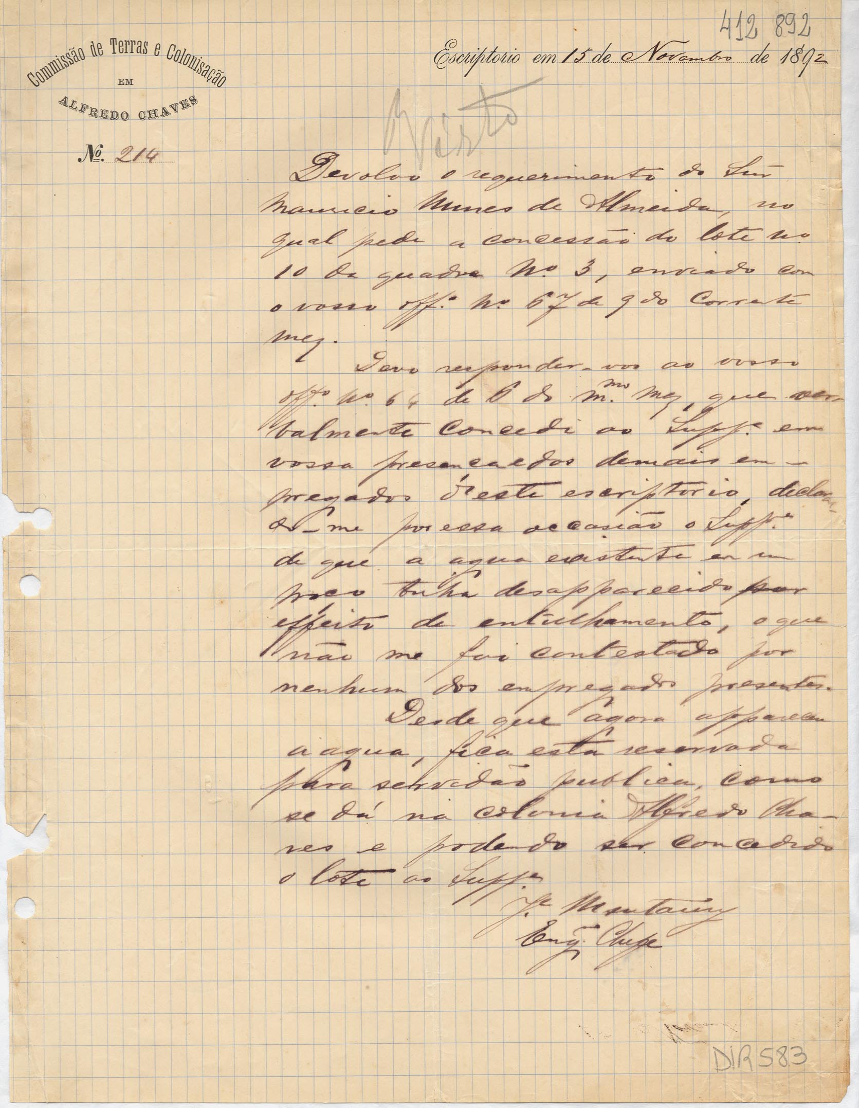 De José Montaury Aguiar Leitão - Engenheiro Chefe da Comissão de Terras em Alfredo Chaves. Assunto: comunica devolução do requerimento de Maurício Nunes de Almeida, solicitando concessão de lote; responde a outro ofício; informa que o poço de água ficou reservado para servidão pública.