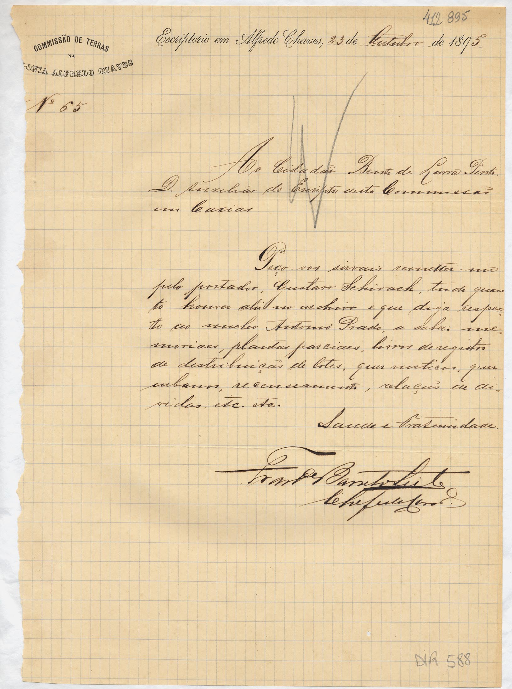 De Francisco Carlos Resin Barreto Leite - Engenheiro Chefe da Comissão de Terras em Alfredo Chaves, para Bento de Lavra Pinto - Auxiliar de Escrita da Comissão em Caxias. Assunto: solicita remessa de tudo que houver no arquivo sobre o núcleo Antonio Prado, como memoriais, plantas, livros de registro de distribuição de lotes, relação de dívidas, etc., pelo portador Gustavo Schivach.