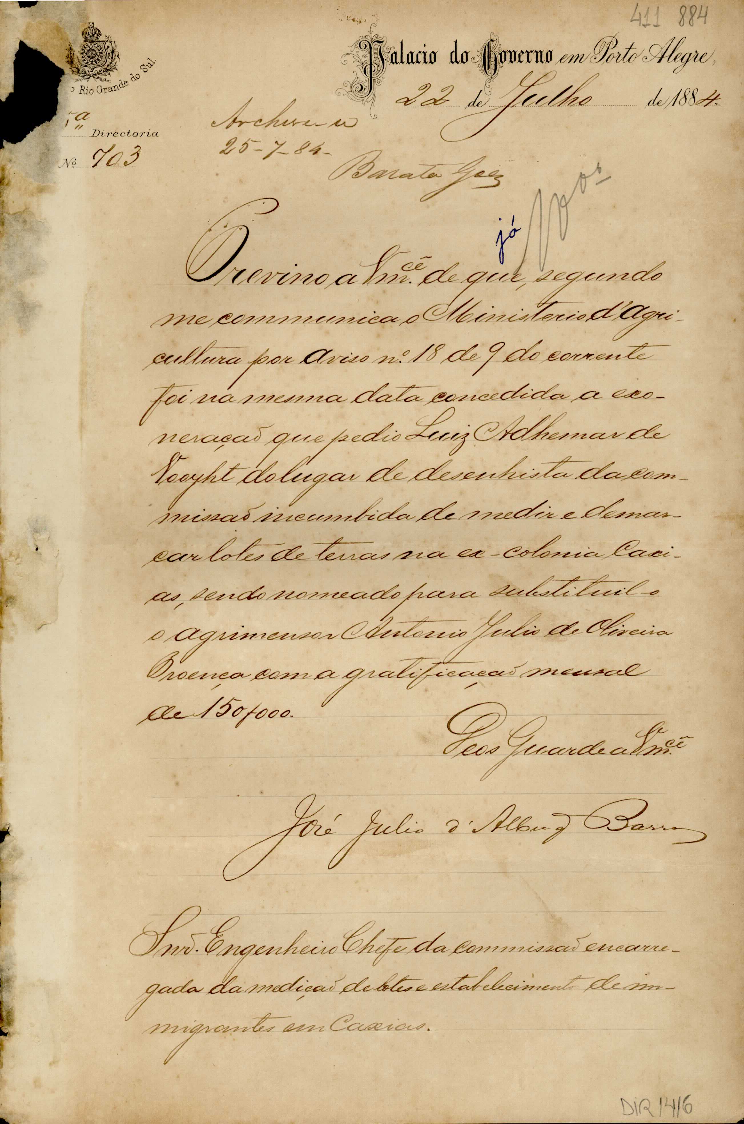 De José Júlio de Albuquerque Barros - Palácio do Governo em Porto Alegre, 5ª Diretoria, para Manoel Barata Góes - Engenheiro Chefe da Comissão de Medição de Terras da ex-Colônia Caxias. Assunto: comunica concessão ao pedido de exoneração de Luiz Adhemar de Vooyht, do cargo de desenhista da Comissão, sendo nomeado para substituí-lo o agrimensor Antonio Júlio de Oliveira Proença. Local : Porto Alegre