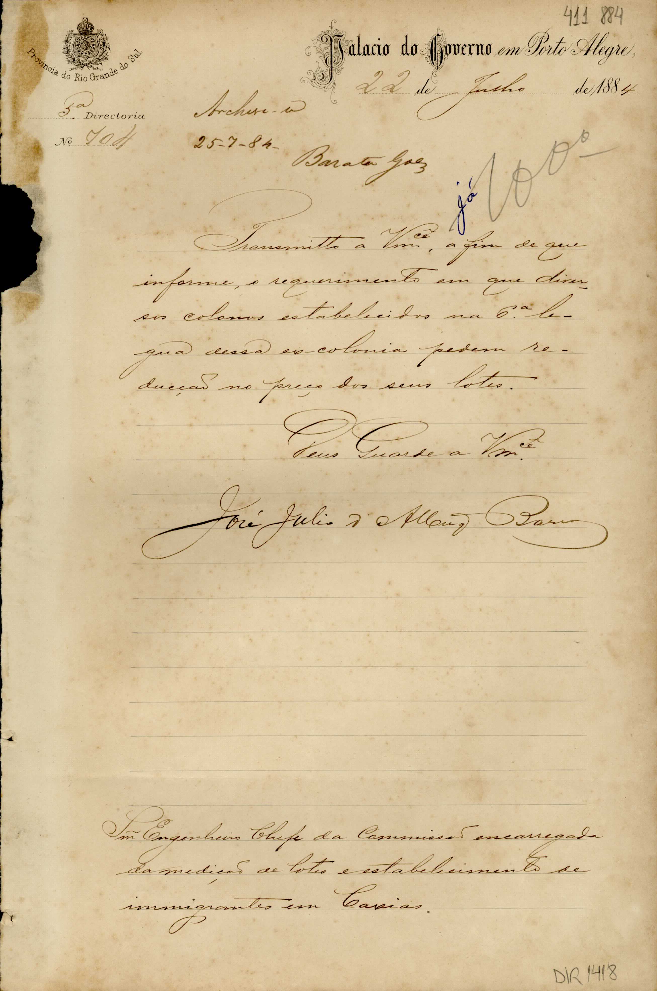 De José Júlio de Albuquerque Barros - Palácio do Governo em Porto Alegre, 5ª Diretoria, para Manoel Barata Góes - Engenheiro Chefe da Comissão de Medição de Terras da ex-Colônia Caxias. Assunto: comunica envio do requerimento de diversos colonos da 6ª legua, solicitando redução no preço dos lotes / solicita informações sobre o requerimento. Local : Porto Alegre