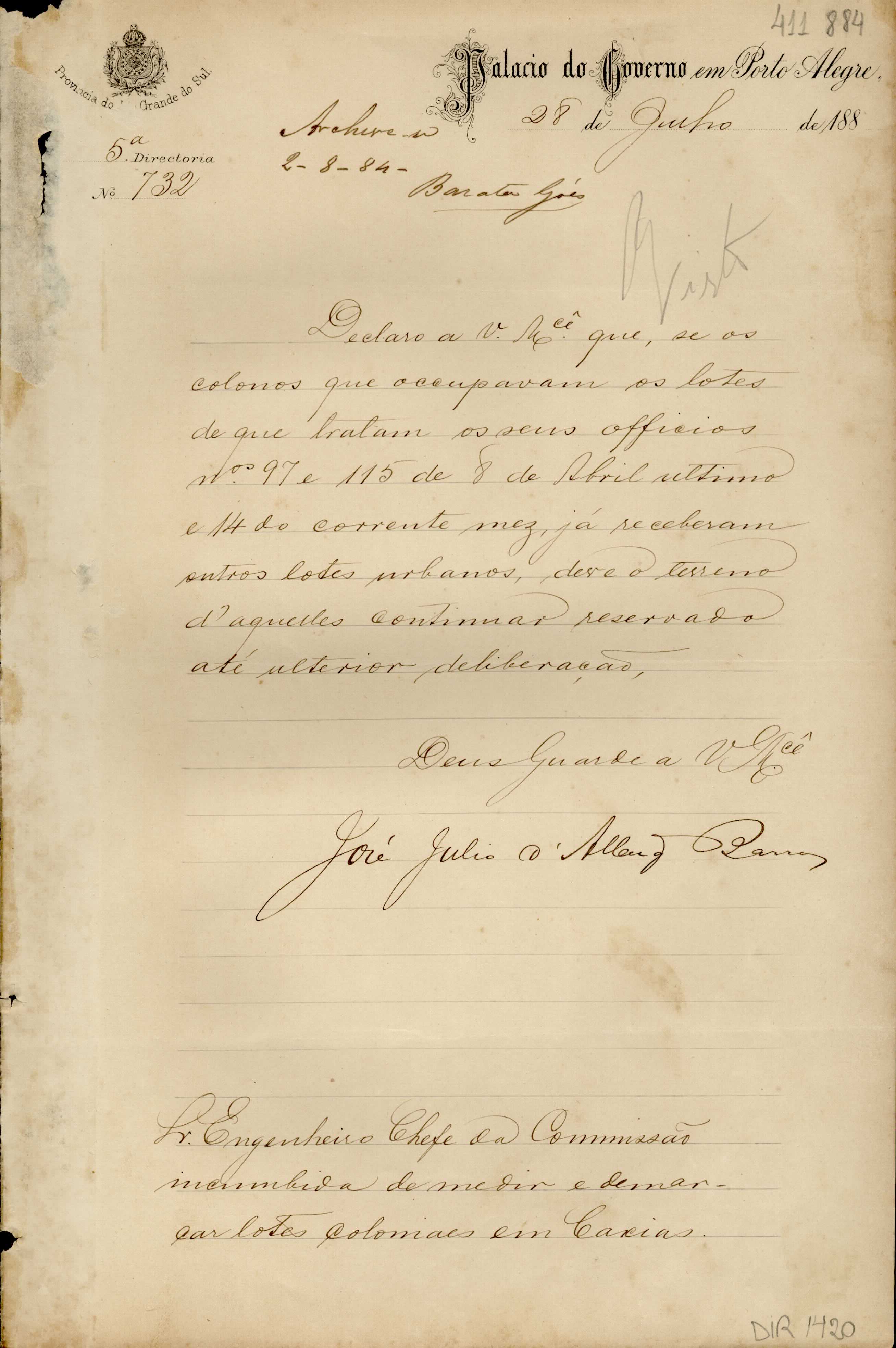 De José Júlio de Albuquerque Barros - Palácio do Governo em Porto Alegre, 5ª Diretoria, para Manoel Barata Góes - Engenheiro Chefe da Comissão de Medição de Terras da ex-Colônia Caxias. Assunto: instruções relativas aos lotes de que tratam os ofícios nos 97 e 115 do corrente ano. Local : Porto Alegre
