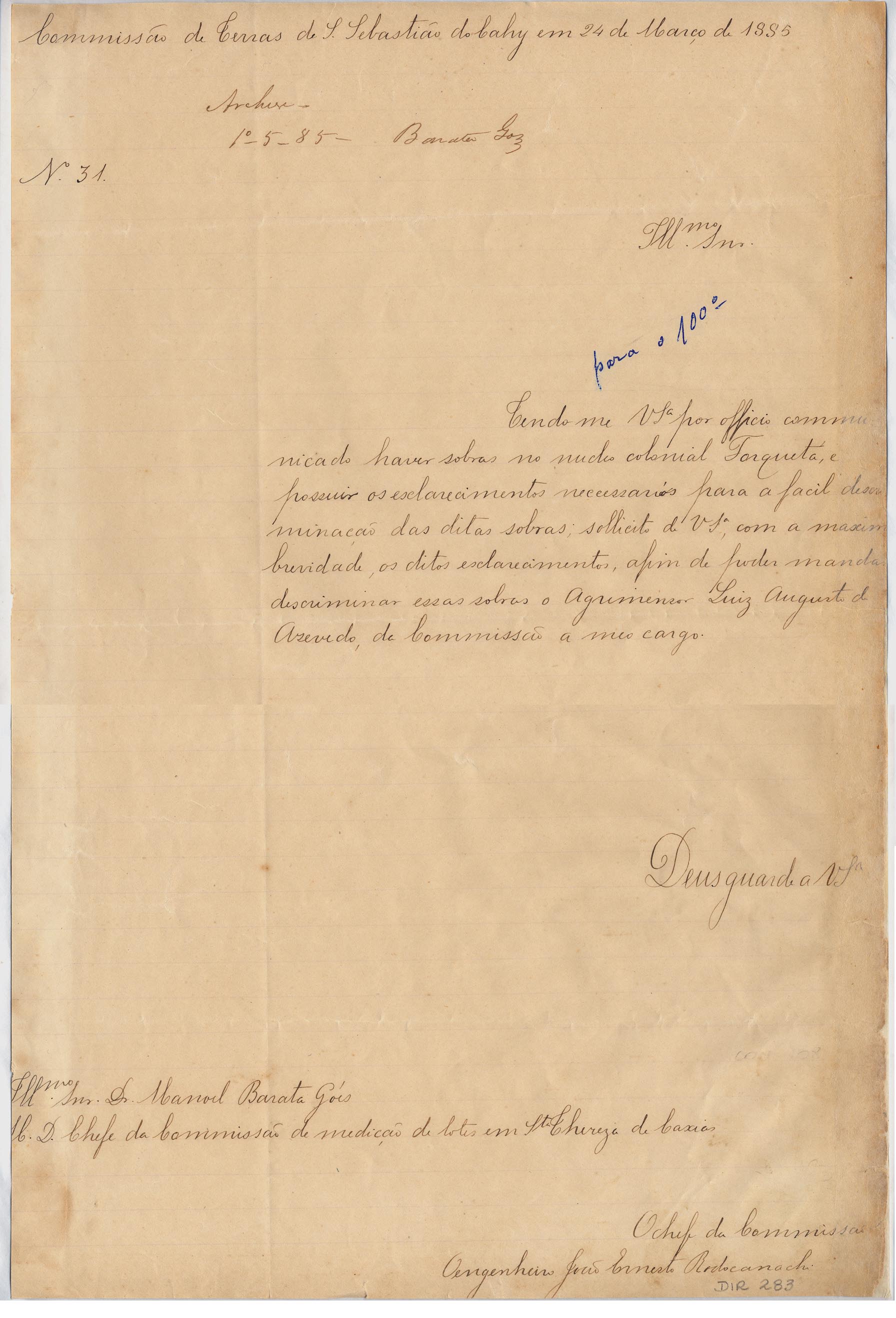 De João Ernesto Rodocanachi - Engenheiro chefe da Comissão de Terras em São Sebastião do Caí, para Manoel Barata Góes - Engenheiro chefe da Comissão de Medição de Lotes em Caxias. Assunto: solicita esclarecimentos sobre sobras existentes no núcleo colonial Forqueta. Local: São Sebastião do Caí.