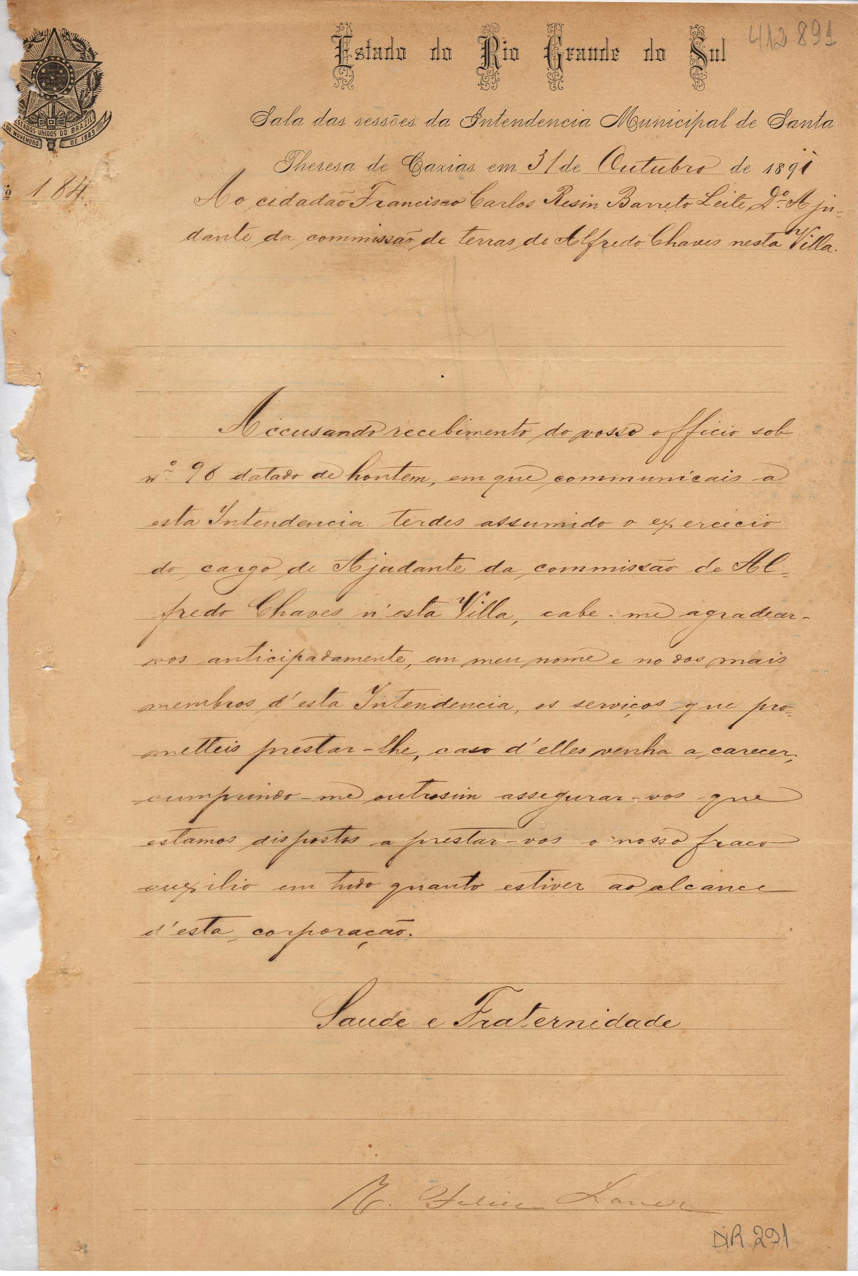 Da Sala de sessões da Intendência Municipal de Santa Tereza de Caxias, para Francisco Carlos Resin Barreto Leite - Ajudante da Comissão de Terras de Alfredo Chaves nesta vila. Assunto: acusa o recebimento de ofício comunicando a posse do cargo de Ajudante da Comissão de Alfredo Chaves. Local: Santa Tereza de Caxias.
