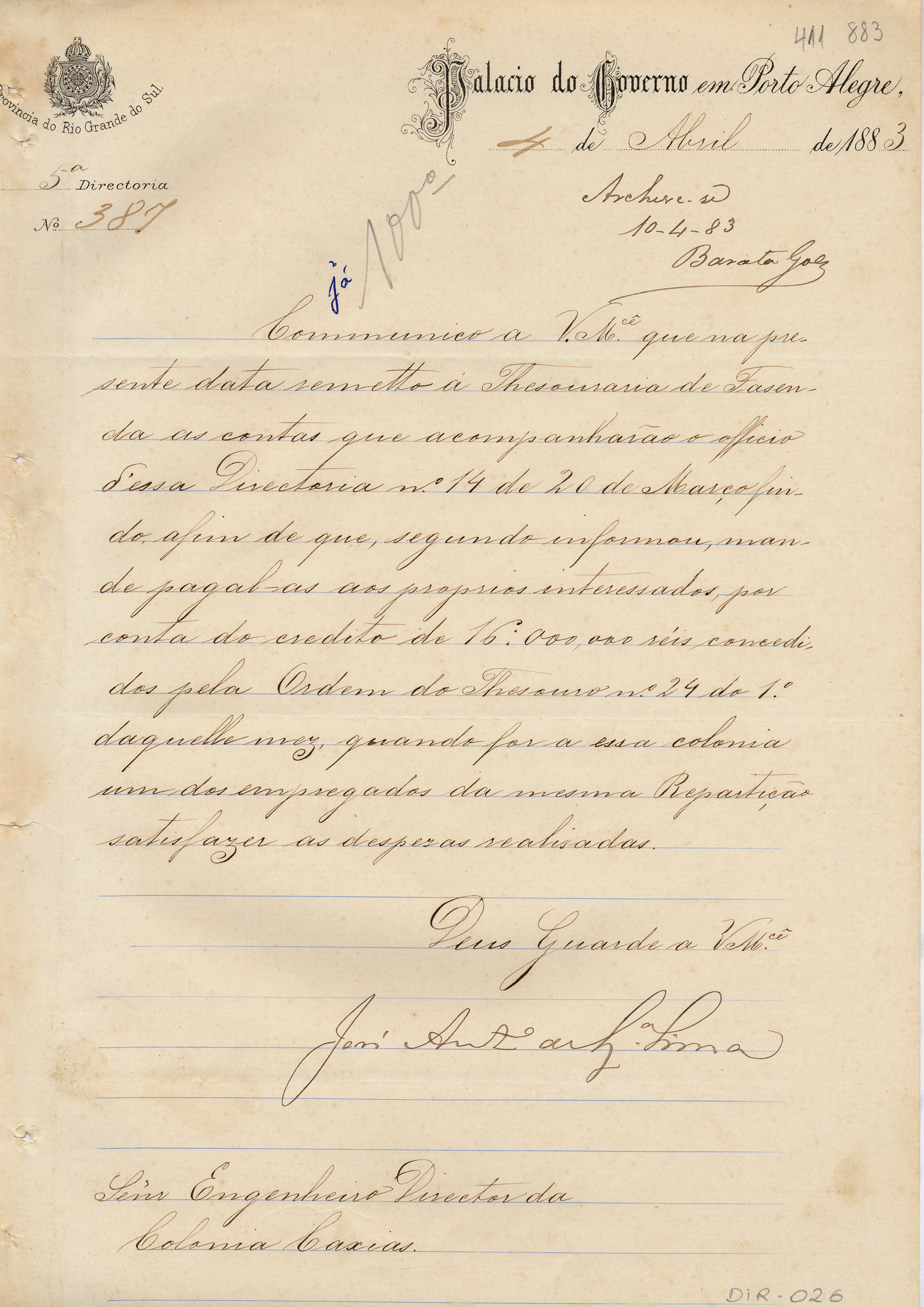 Do Palácio do Governo - 5ª Diretoria - Dr. José Antonio de Souza Lima, para o Engenheiro Diretor da Colônia Caxias. Assunto: comunica remessa de contas à Tesouraria da Fazenda, para que se efetue o pagamento das mesmas aos interessados. Local: Porto Alegre.