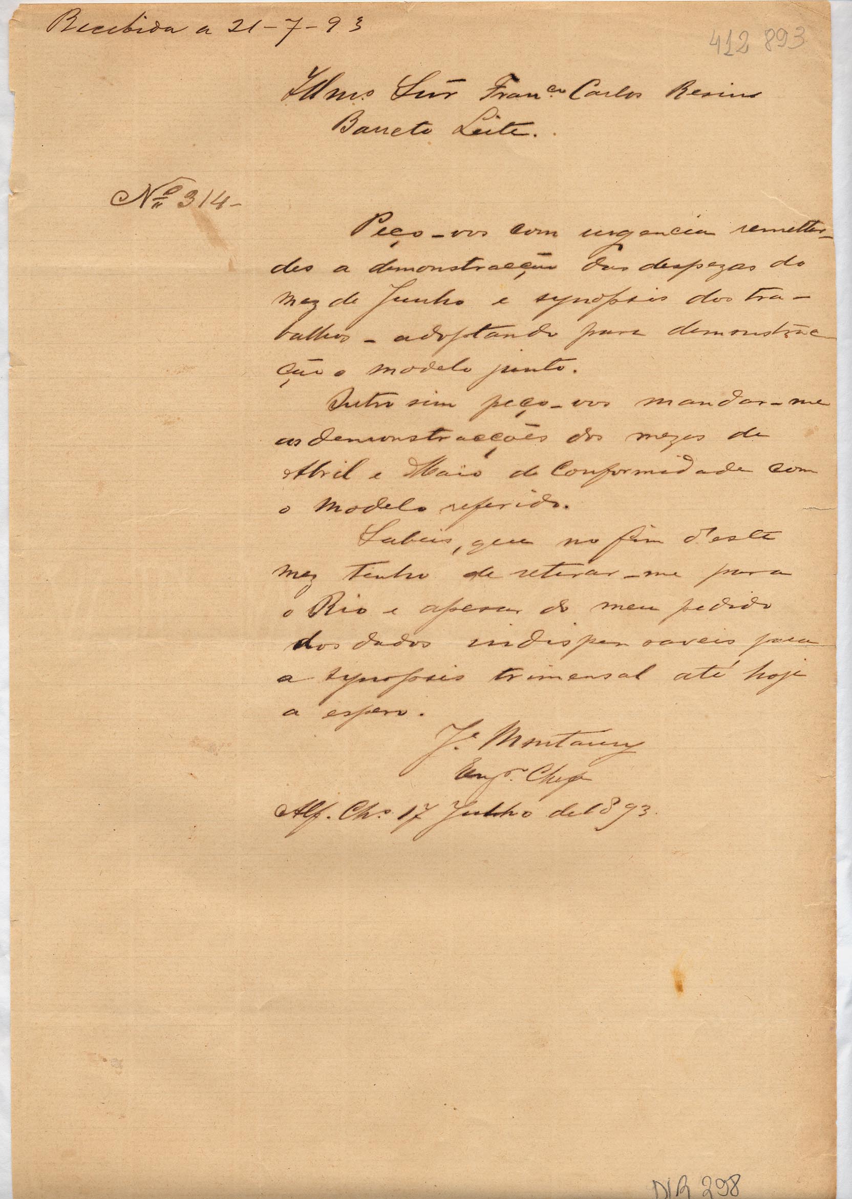 De José Montaury - Engenheiro chefe da Comissão de Terras de Alfredo Chaves, para Francisco Carlos Resin Barreto Leite - Ajudante da Comissão de Terras. Assunto: solicita com urgência a demonstração das despesas de junho e síntese dos trabalhos, de acordo com o modelo; solicita também as demonstrações dos meses de abril e maio. Local: Alfredo Chaves.