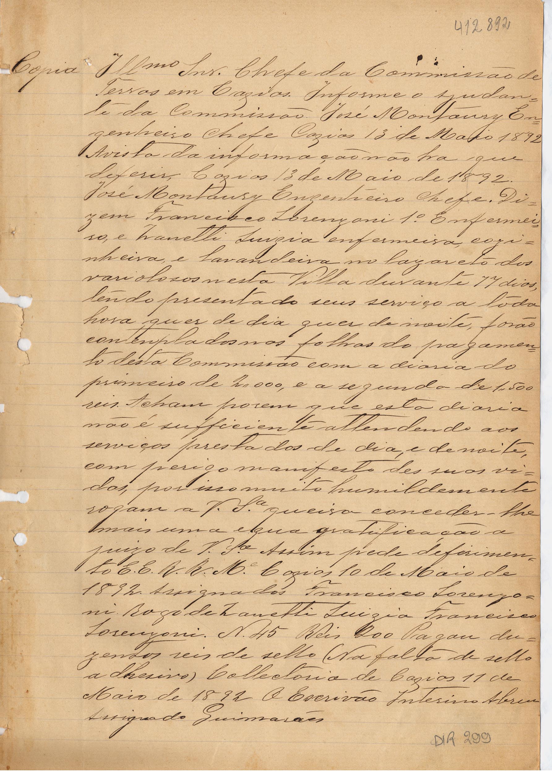 De Francisco Lorenzoni - enfermeiro, para José Montaury - Engenheiro chefe da Comissão de Terras em Caxias. Assunto: Francisco Lorenzoni solicita, em seu nome e de Luigia Zanetti, enfermeira, aumento dos vencimentos que receberam, em vista do trabalho diurno e noturno e de alto risco, que efetuaram.