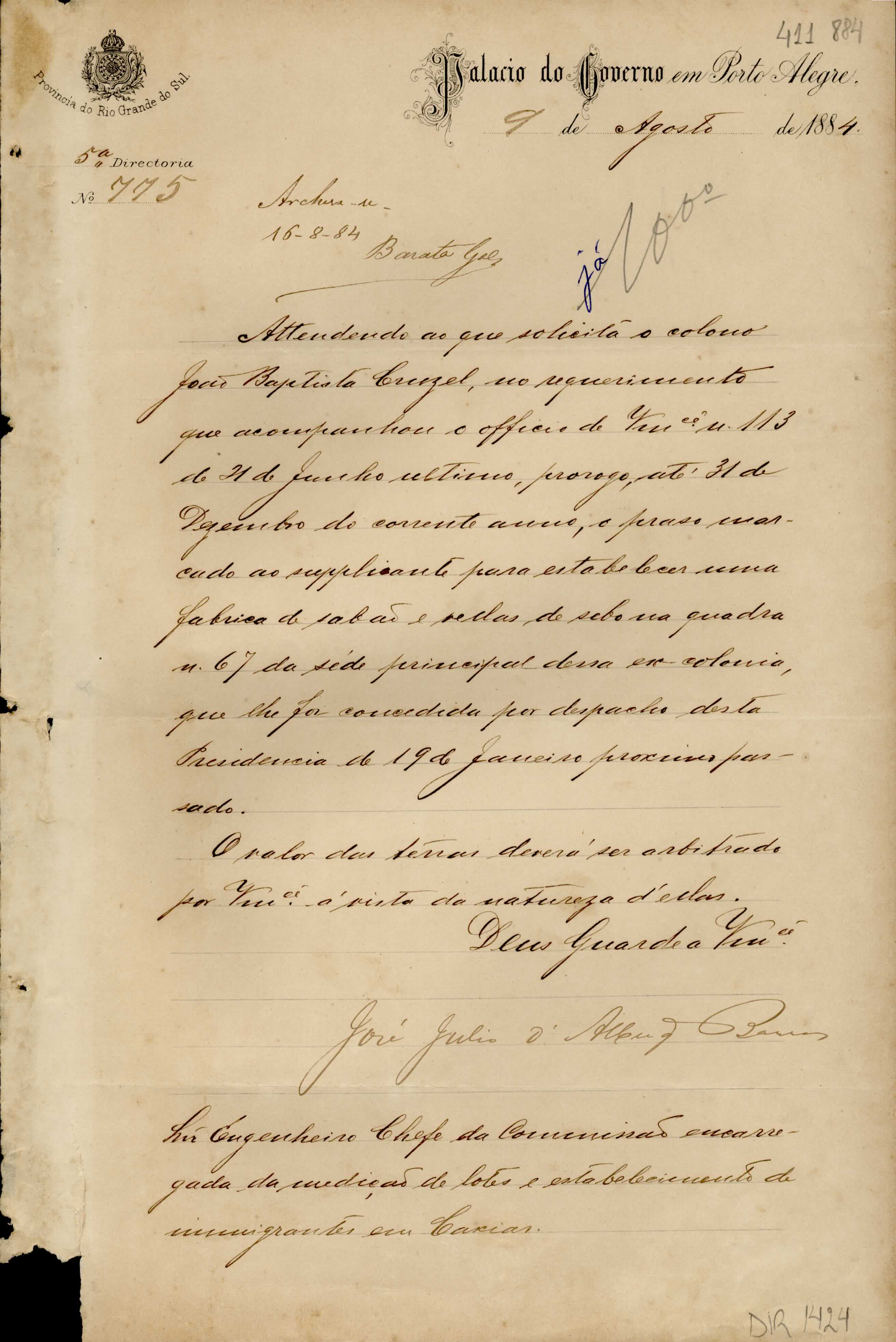 De José Júlio de Albuquerque Barros - Palácio do Governo em Porto Alegre, 5ª Diretoria, para Manoel Barata Góes - Engenheiro Chefe da Comissão de Medição de Terras da ex-Colônia Caxias. Assunto: comunica a prorrogação de prazo concedida ao colono João Baptista Curzel, para estabelecimento de fábrica de sabão e velas de sebo. Local : Porto Alegre