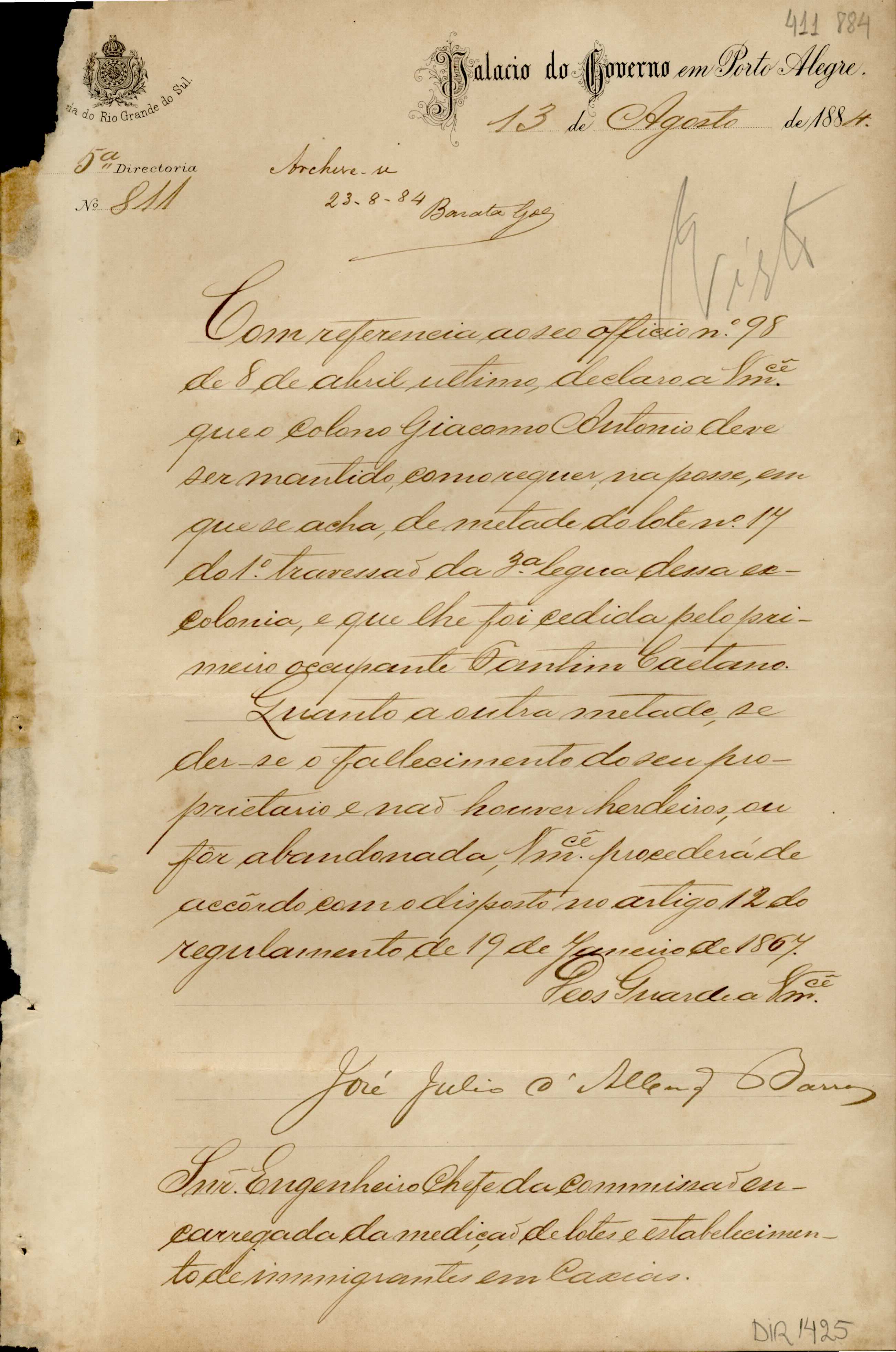 De José Júlio de Albuquerque Barros - Palácio do Governo em Porto Alegre, 5ª Diretoria, para Manoel Barata Góes - Engenheiro Chefe da Comissão de Medição de Terras da ex-Colônia Caxias. Assunto: informações sobre questões de terras com o colono Giacomo Antonio. Local: Porto Alegre