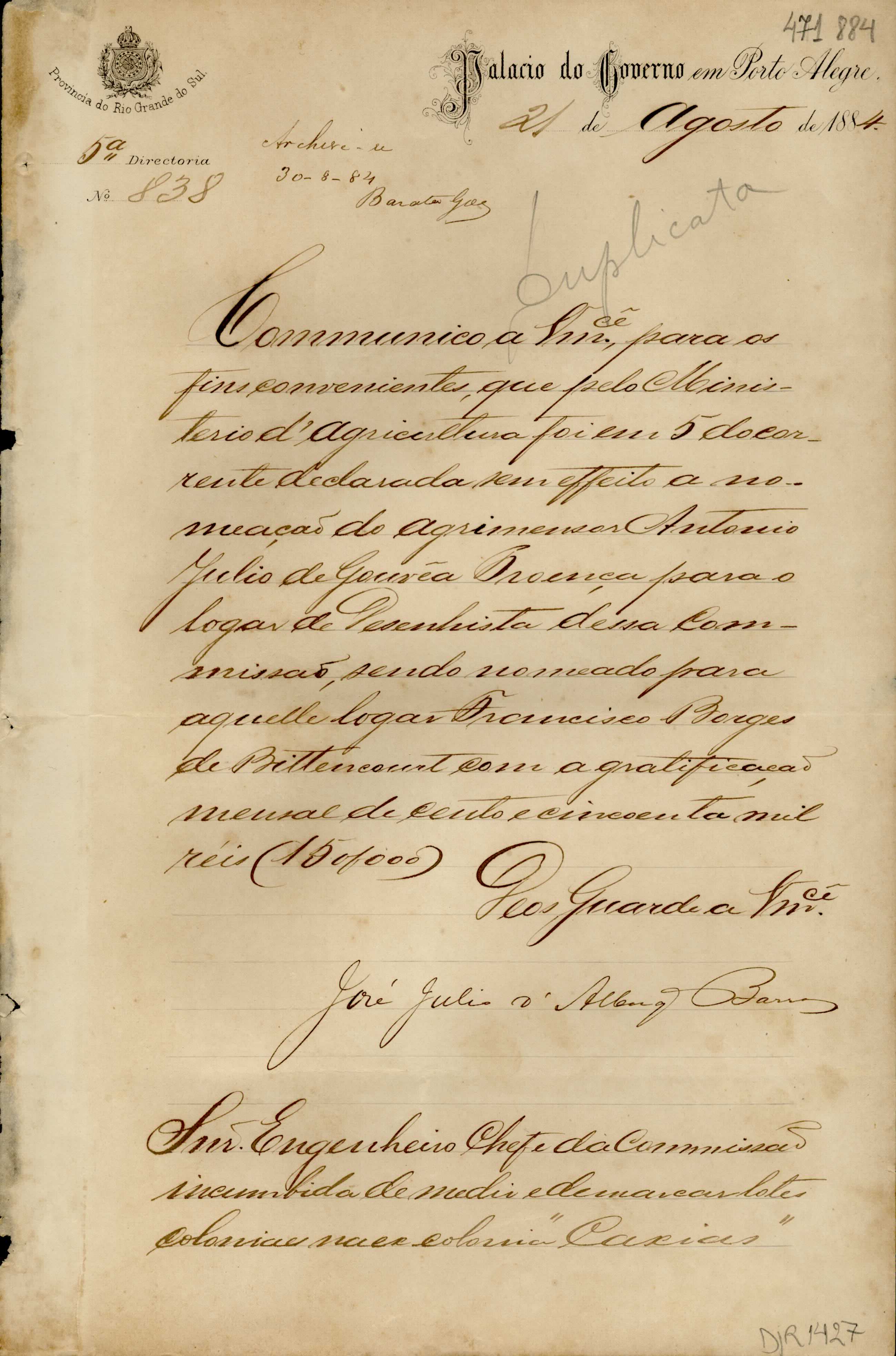 De José Júlio de Albuquerque Barros - Palácio do Governo em Porto Alegre, 5ª Diretoria, para Manoel Barata Góes - Engenheiro Chefe da Comissão de Medição de Terras da ex-Colônia Caxias. Assunto: comunica a exoneração de Antonio Julio de Gouvêa Proença, do cargo de desenhista; e a nomeação de Francisco Borges de Bittencourt, para o mesmo cargo. Local: Porto Alegre