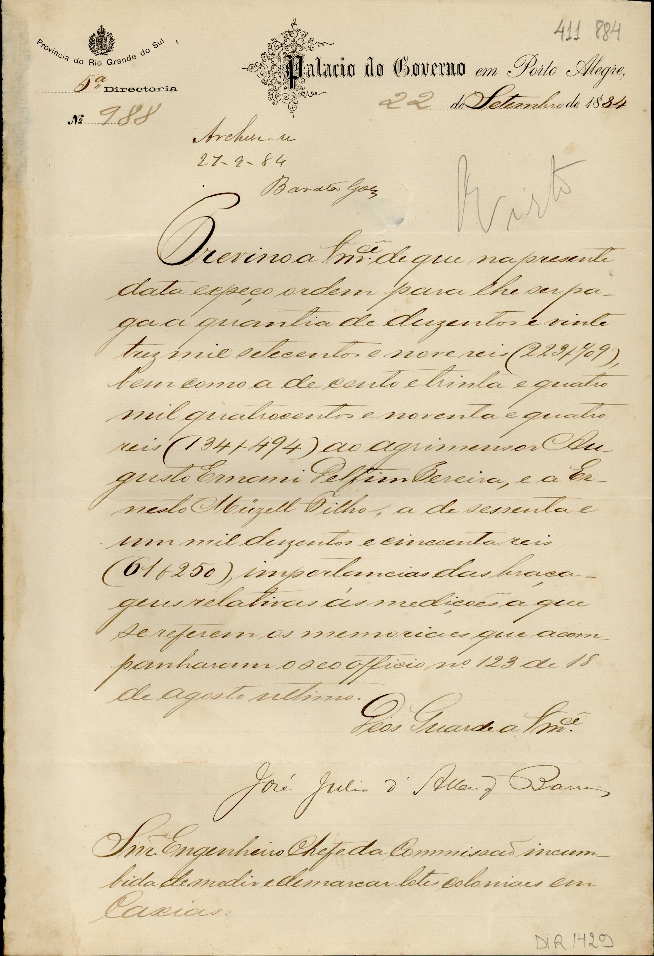 De José Júlio de Albuquerque Barros - Palácio do Governo em Porto Alegre, 5ª Diretoria, para Manoel Barata Góes - Engenheiro Chefe da Comissão de Medição de Terras da ex-Colônia Caxias. Assunto: comunica autorização de pagamento aos agrimensores Augusto Ernani Delfim Pereira e Ernesto Müzell Filho. Local : Porto Alegre