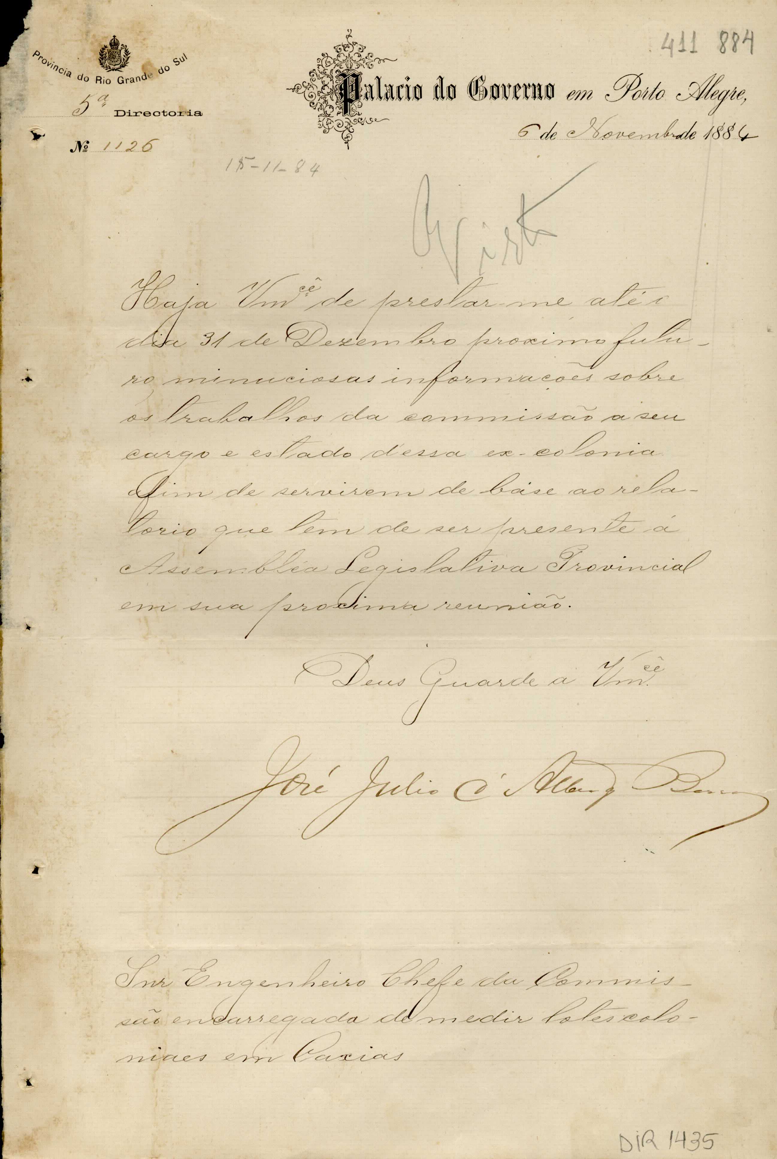 De José Júlio de Albuquerque Barros - Palácio do Governo em Porto Alegre, 5ª Diretoria, para Manoel Barata Góes - Engenheiro Chefe da Comissão de Medição de Terras da ex-Colônia Caxias. Assunto: solicita relatório sobre trabalhos da Comissão de Terras.