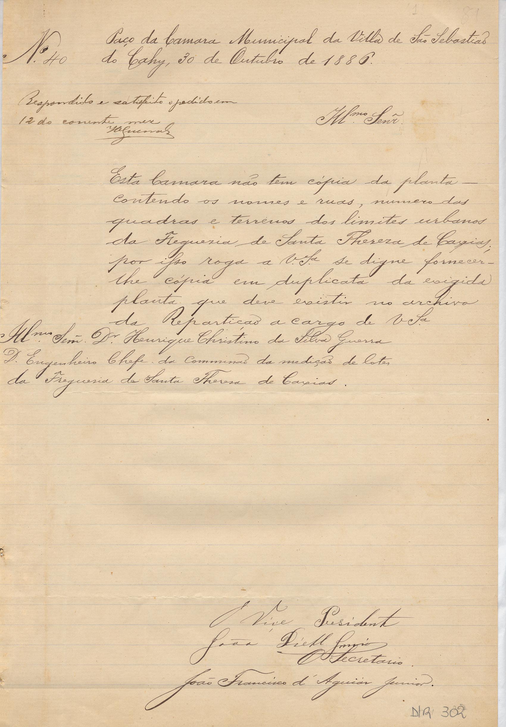 Da Câmara Municipal de São Sebastião do Caí para Henrique C. da Silva Guerra - Engenheiro chefe da Comissão de Medição de Lotes da Freguesia de Caxias. Assunto: solicita cópia da planta da freguesia de Santa Tereza de Caxias, com nomes de ruas e números das quadras e terrenos. Local: São Sebastião do Caí.