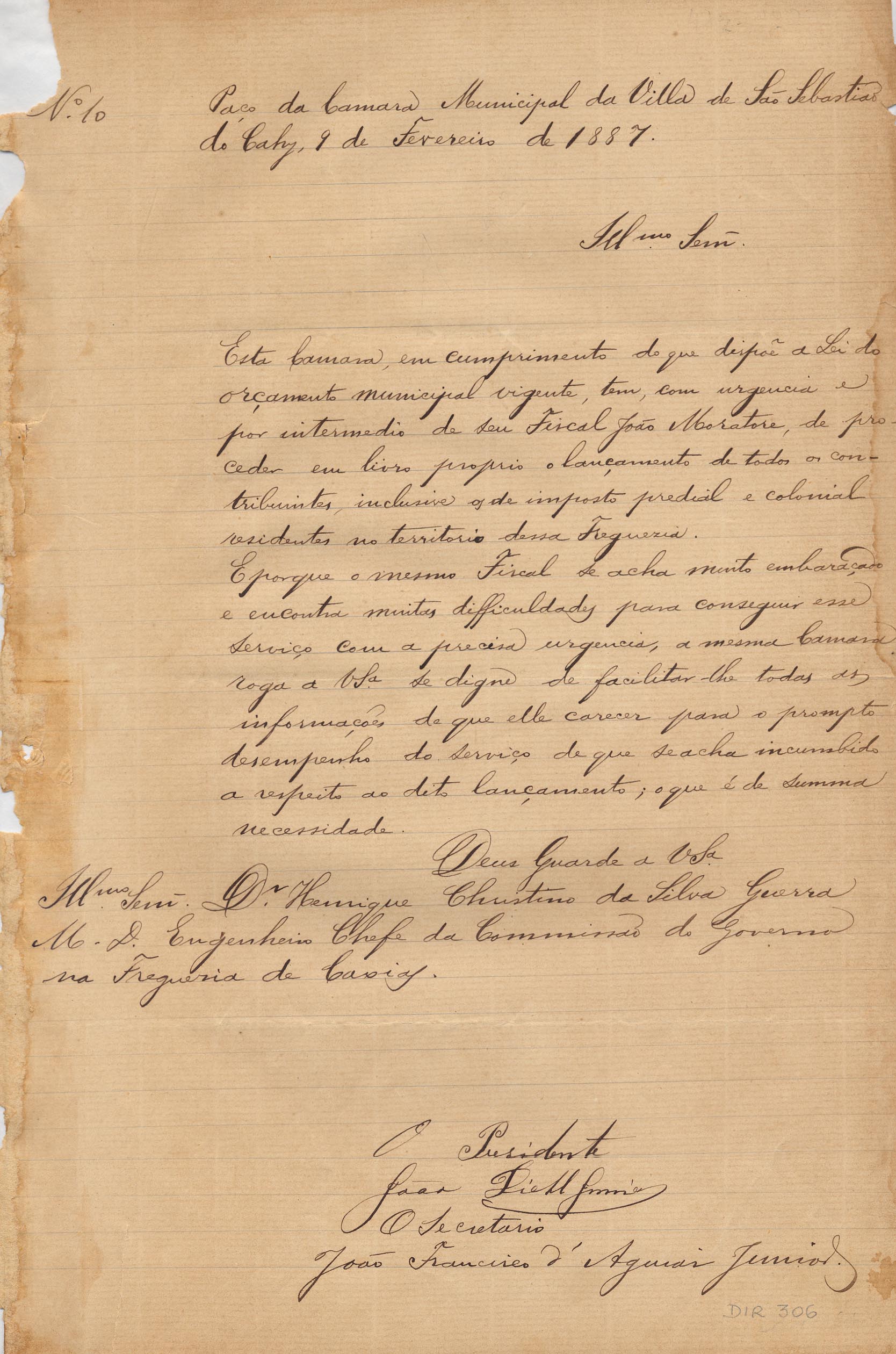 De João Diehl Jr. - Presidente e João Francisco D'Aguiar Jr. - Secretário da Câmara Municipal de São Sebastião do Caí, para Henrique C. da Silva Guerra - Engenheiro chefe da Comissão de Terras em Caxias. Assunto: informa a necessidade da Câmara fazer um livro próprio para o lançamento de todos os contribuintes da freguesia; solicita colaboração com o fiscal João Moratore (Muratore). Local: São Sebastião do Caí.