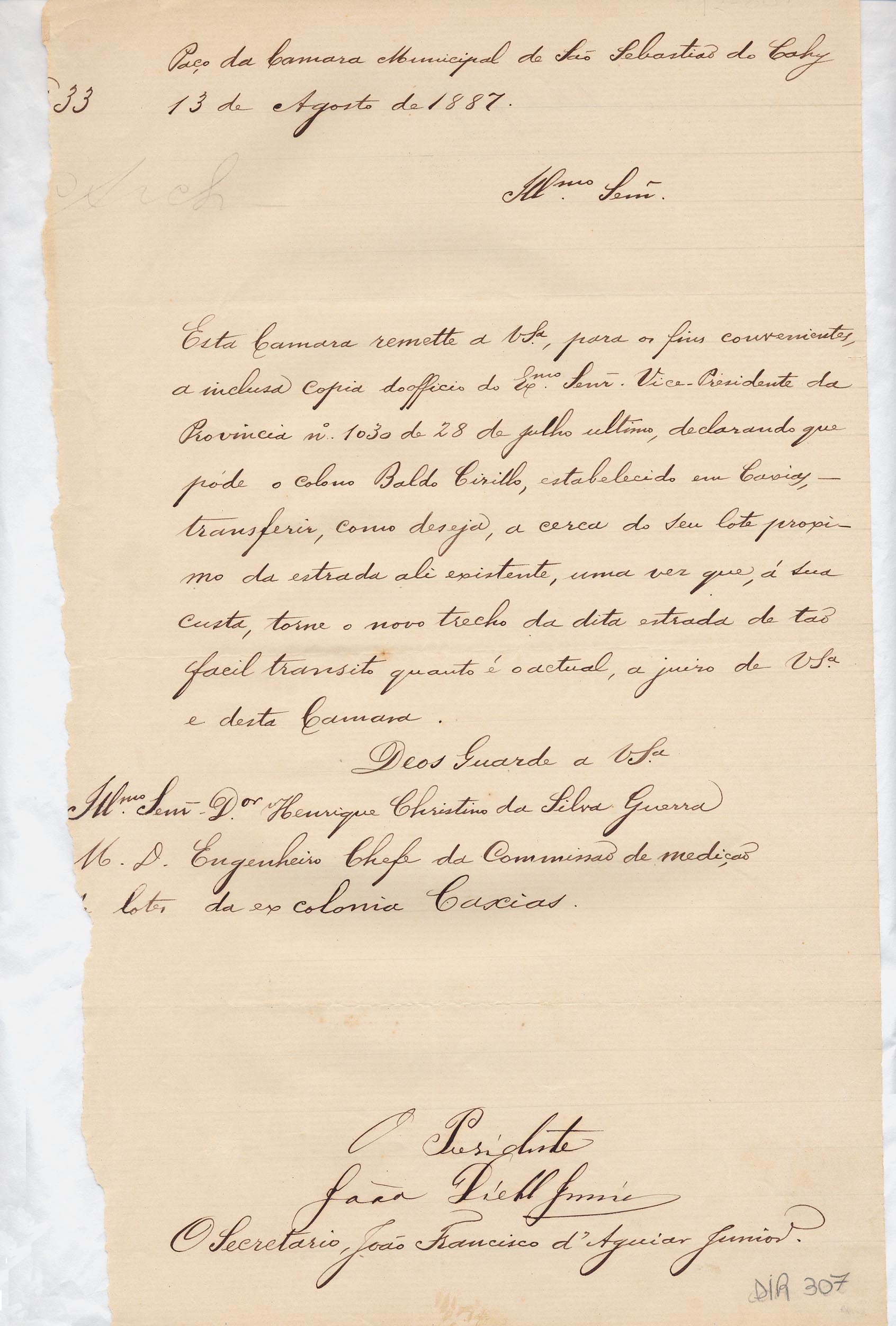 De João Diehl Jr. - Presidente e João Francisco D'Aguiar Jr. - Secretário da Câmara Municipal de São Sebastião do Caí, para Henrique C. da Silva Guerra - Engenheiro chefe da Comissão de Terras em Caxias. Assunto: comunica envio de cópia do ofício do vice-presidente da província, aprovando transferência de cerca do lote do colono Baldo Cirillo à sua custa, facilitando o trânsito no trecho da estrada. Local: São Sebastião do Caí.