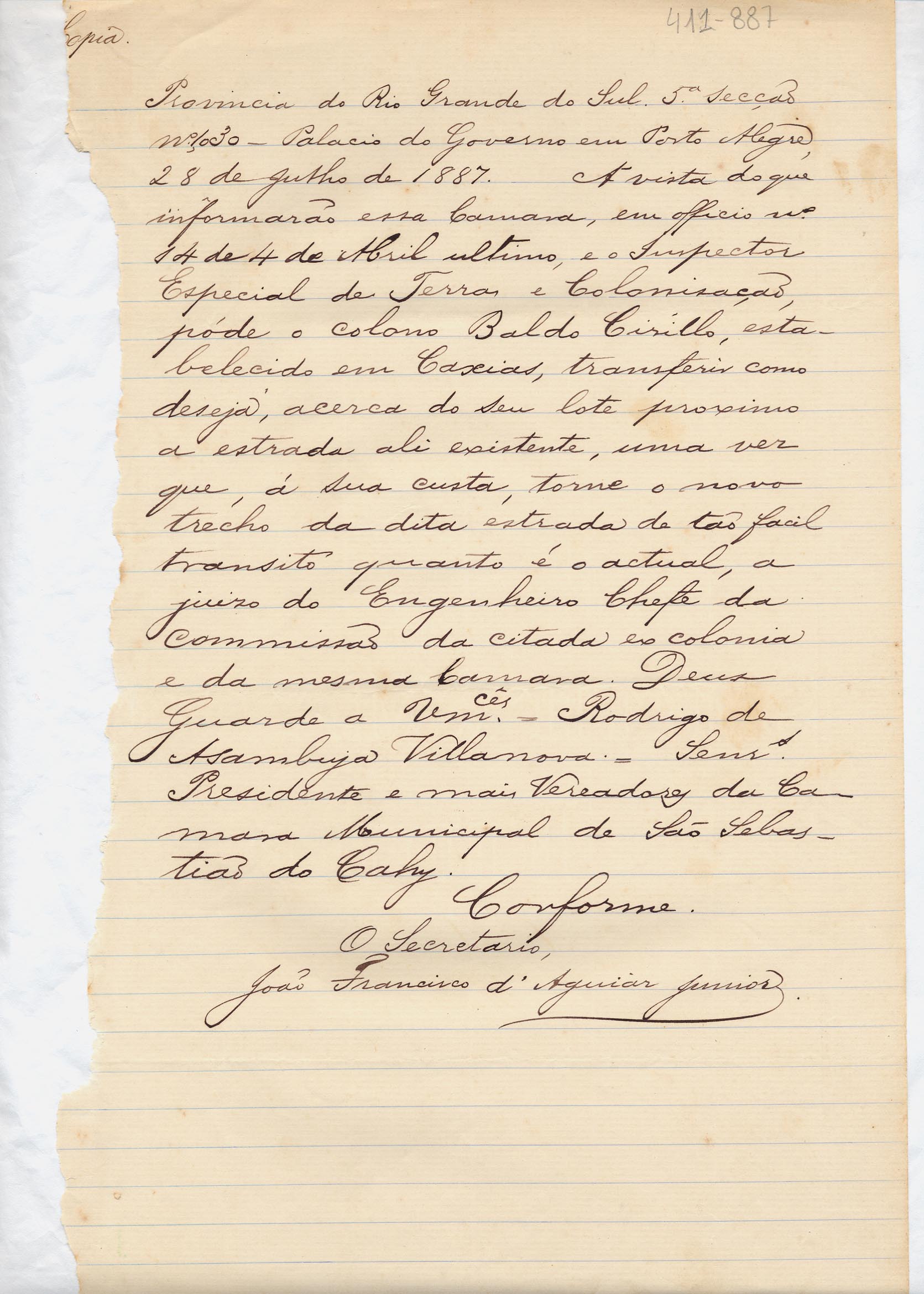 De Rodrigo de Azambuja Villanova - Palácio do Governo em Porto Alegre, para João Francisco D'Aguiar Jr. - Secretário da Câmara Municipal de São Sebastião do Caí. Assunto: comunica autorização para o colono Baldo Cirillo, de Caxias, transferir a cerca de seu lote, desde que mantenha o trecho da estrada de fácil acesso. Local: Porto Alegre.