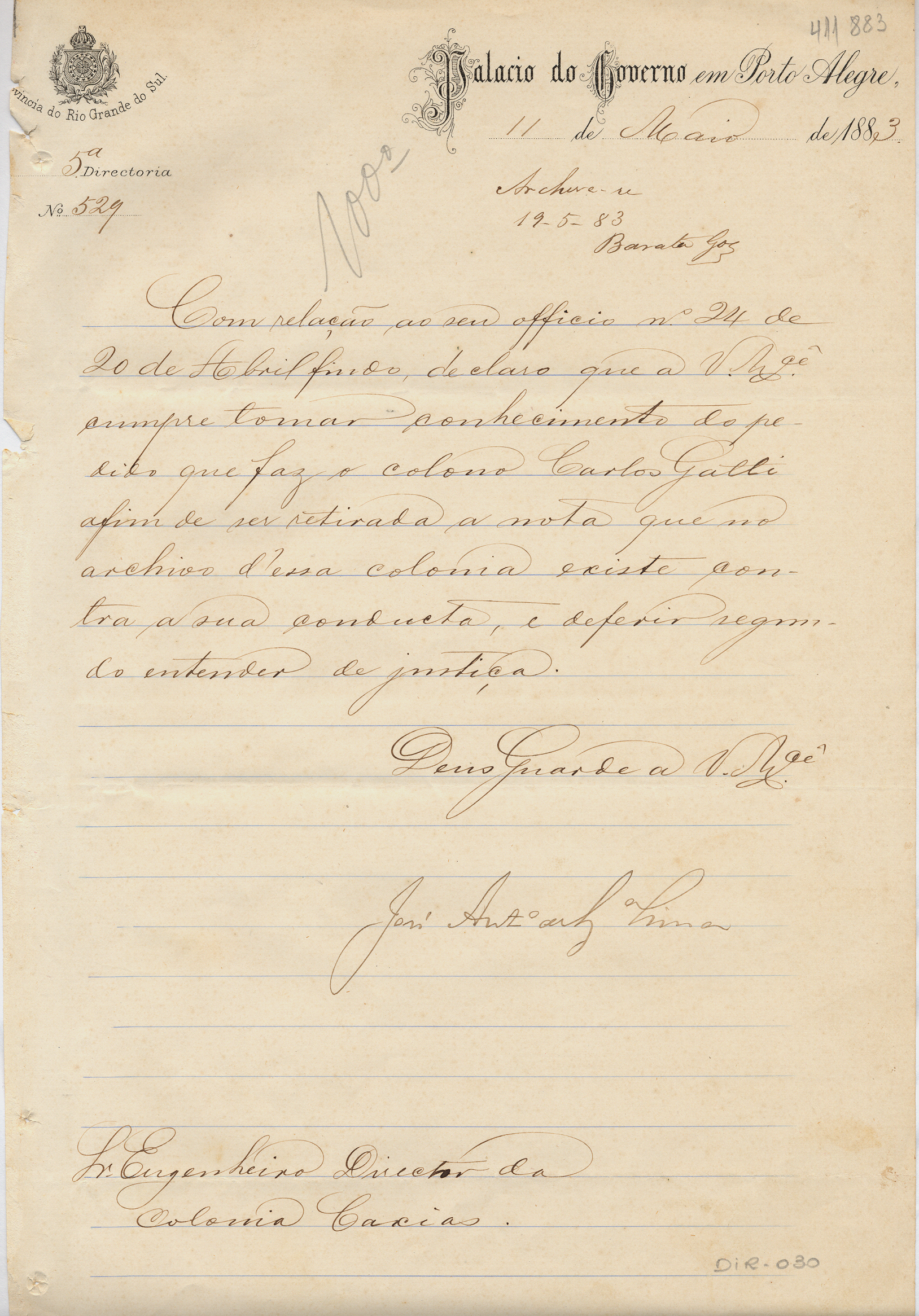 Do Palácio do Governo - 5ª Diretoria - Dr. José Antonio de Souza Lima, para o Engenheiro Diretor da Colônia Caxias. Assunto: solicita medidas em relação a retirada de nota arquivada, que informa sobre a conduta do colono Carlos Gatti. Local: Porto Alegre.