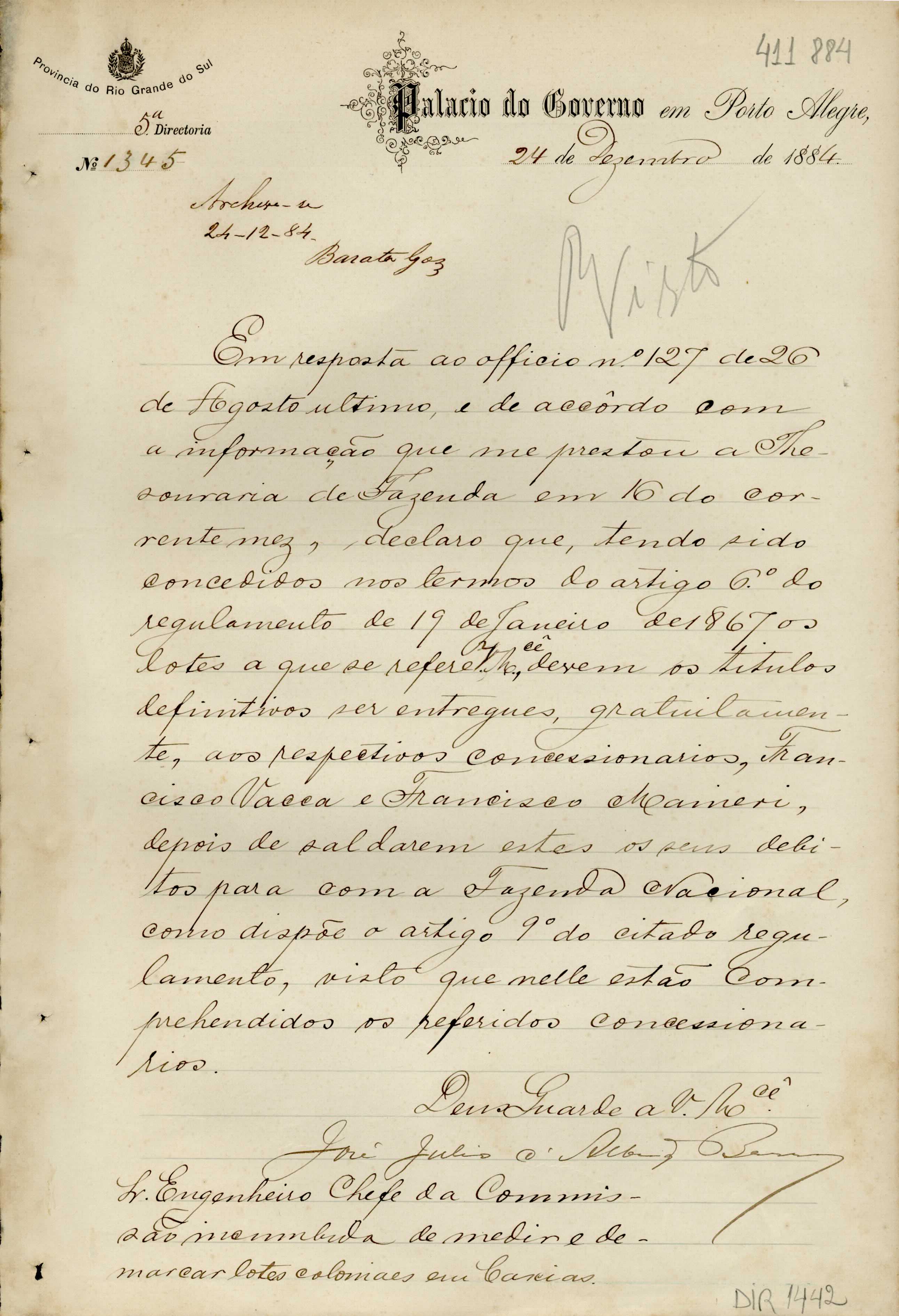 De José Júlio de Albuquerque Barros - Palácio do Governo em Porto Alegre, 5ª Diretoria, para Manoel Barata Góes - Engenheiro Chefe da Comissão de Medição de Terras da ex-Colônia Caxias. Assunto: comunica autorização para pagamento de medições e do agrimensor Glodomiro Paredes. Local : Porto Alegre