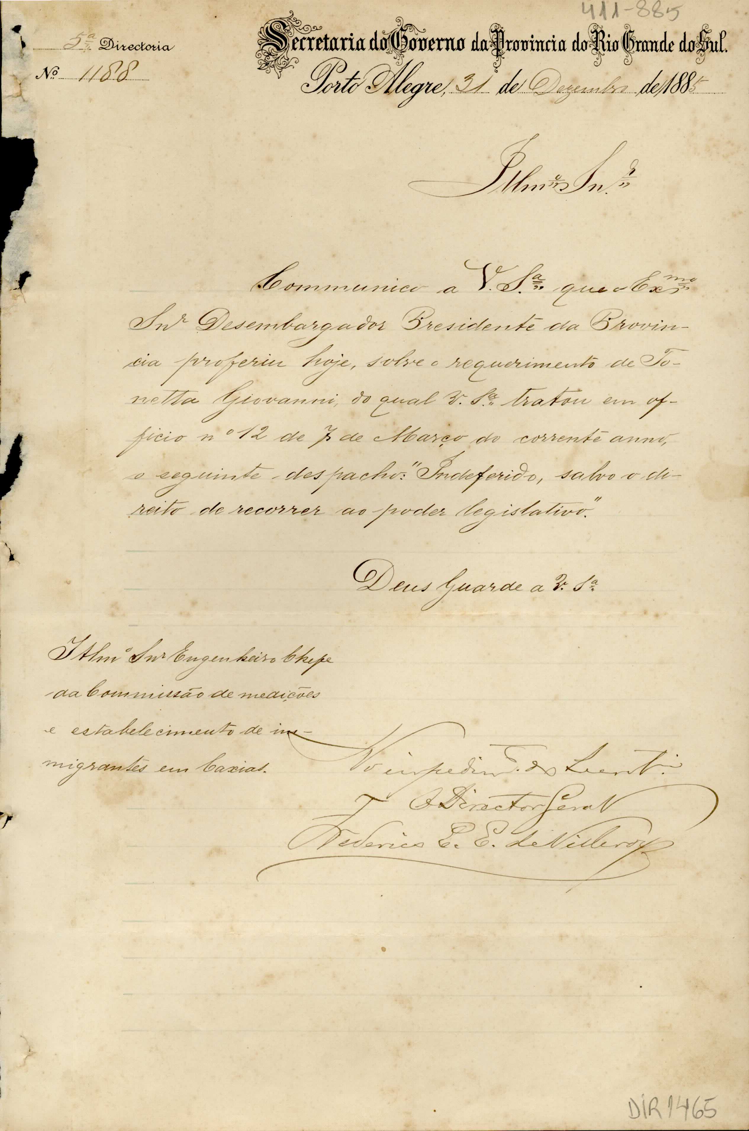 De Frederico E. E. de Villeroy - Diretor Geral da Secretaria do Governo da Província do Rio Grande do Sul em Porto Alegre, para Manoel Barata Góes - Eng. Chefe da Comissão de Medição de Lotes em Caxias. Assunto: comunica o indeferimento do requerimento de Tonetta Giovanni. Local : Porto Alegre