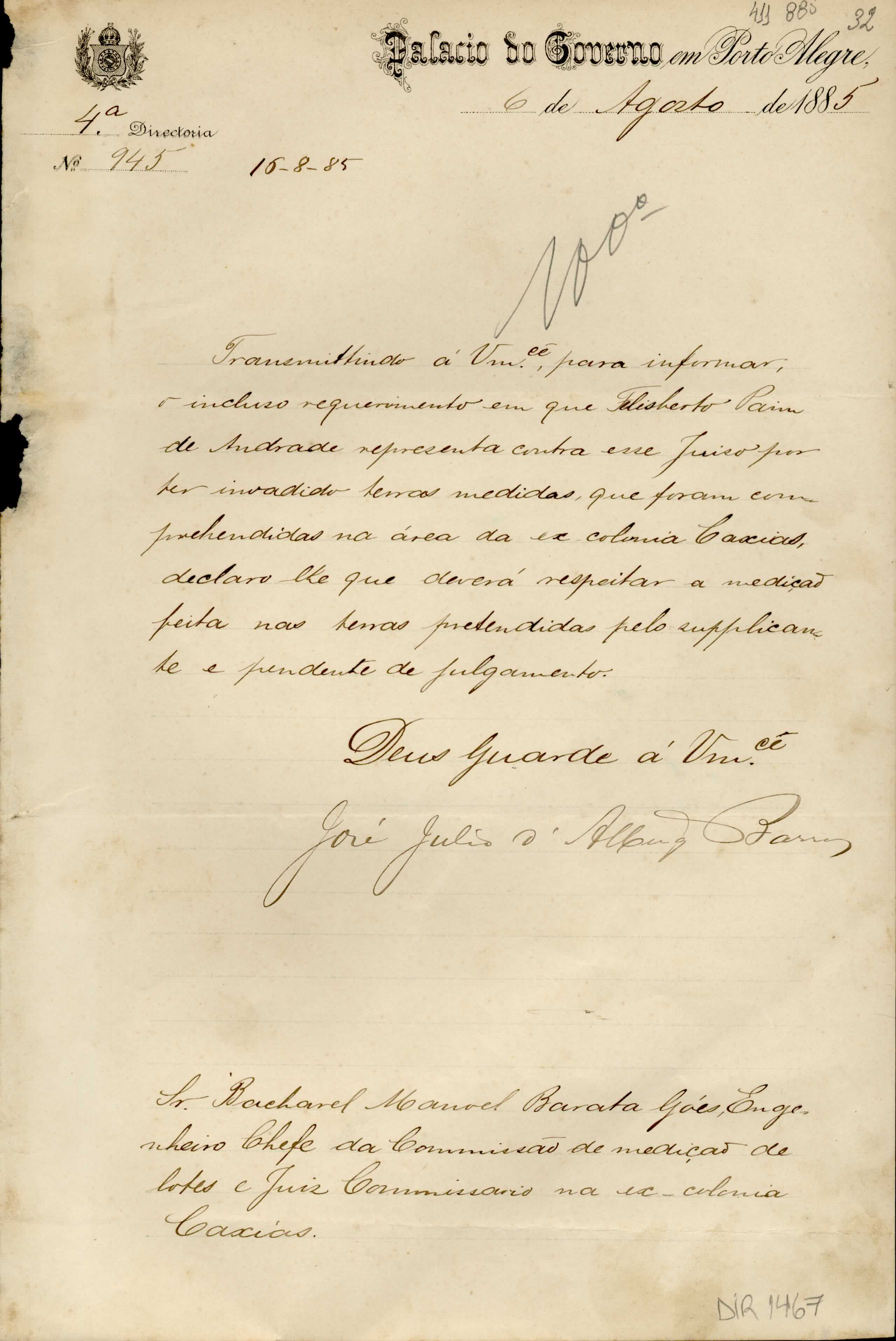 De José Julio de Albuquerque Barros - Palácio do Governo em Porto Alegre, 4ª Diretoria, para Manoel Barata Góes - Engenheiro Chefe da Comissão de Medição de Lotes em Caxias. Assunto: solicita informações sobre o requerimento de Felisberto Paim de Andrade contra o Juízo, por terem invadido as terras pretendidas por ele. Local : Porto Alegre