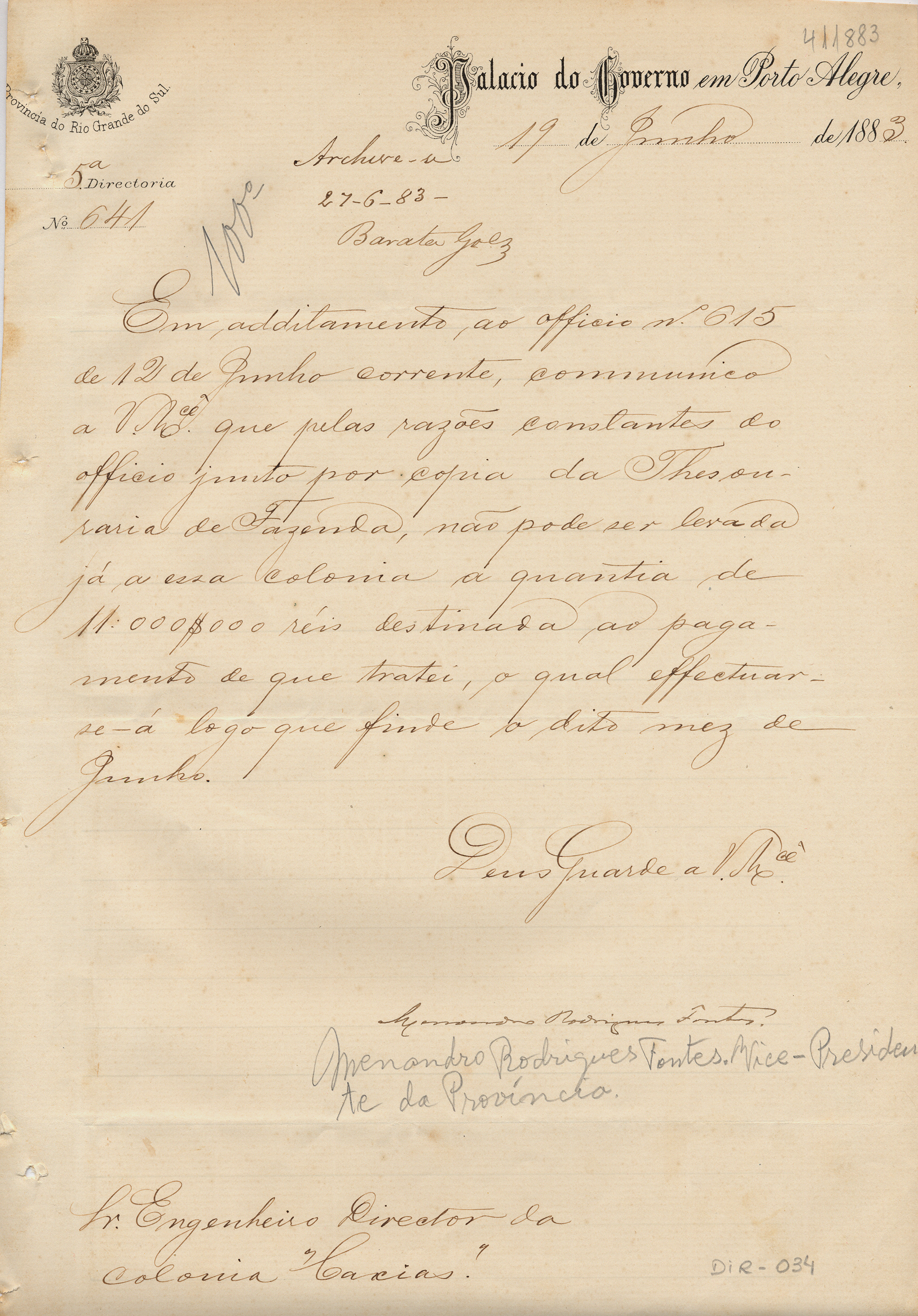 Do Palácio do Governo - 5ª Diretoria - Menandro Rodrigues Fontes - Vice-Presidente da Província do RS, para o Engenheiro Diretor da Colônia Caxias. Assunto: adia o pagamento de que trata o ofício de 12 de junho. Local: Porto Alegre.