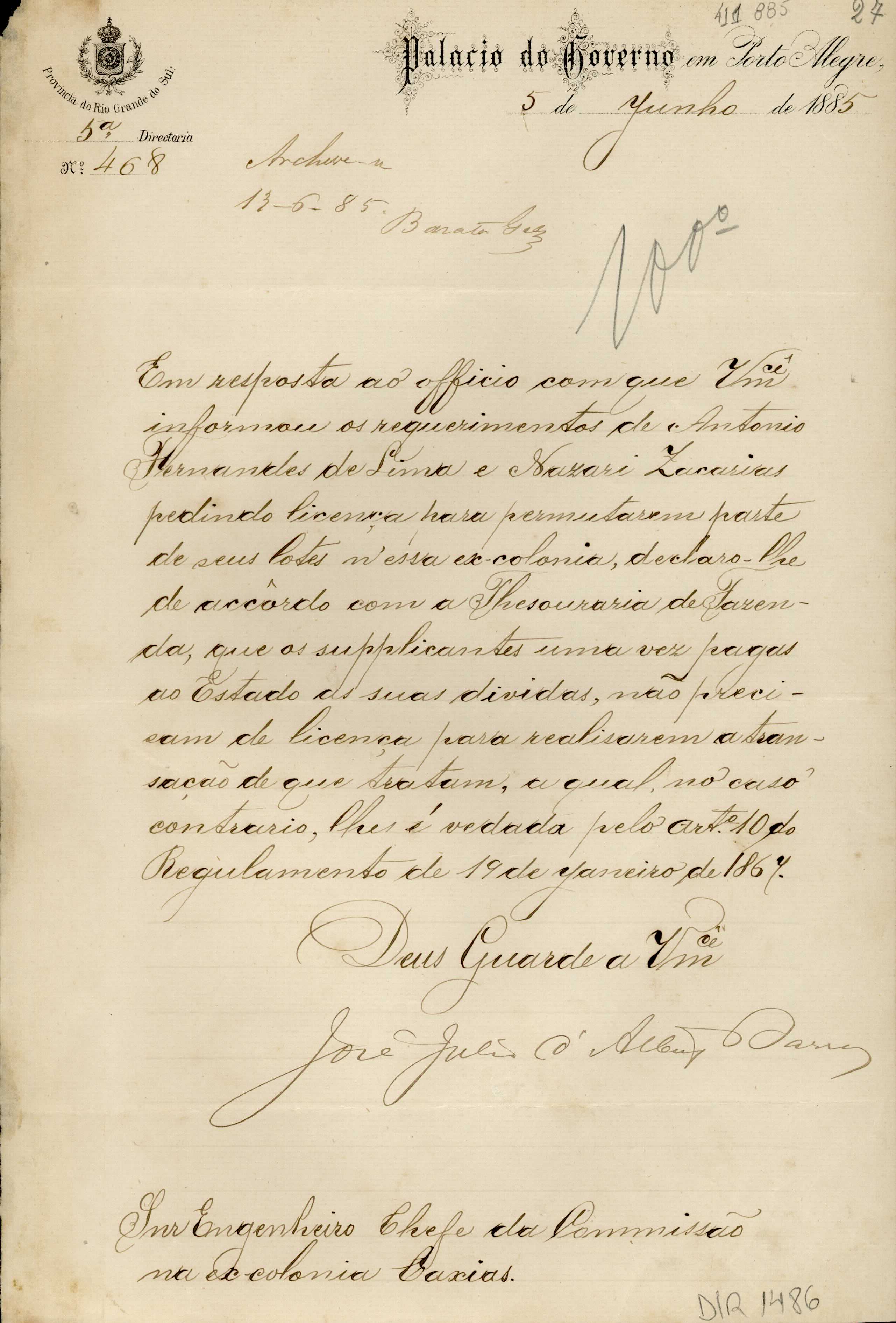 De José Julio de Albuquerque Barros - Palácio do Governo em Porto Alegre, 5ª Diretoria, para Manoel Barata Góes - Engenheiro Chefe da Comissão de Medição de Lotes em Caxias. Assunto: informa que os suplicantes Antonio Fernandes de Lima e Nazari Zacarias, que solicitam licença para permutarem parte de seus lotes, não necessitam da licença se pagarem suas dívidas. Local : Porto Alegre