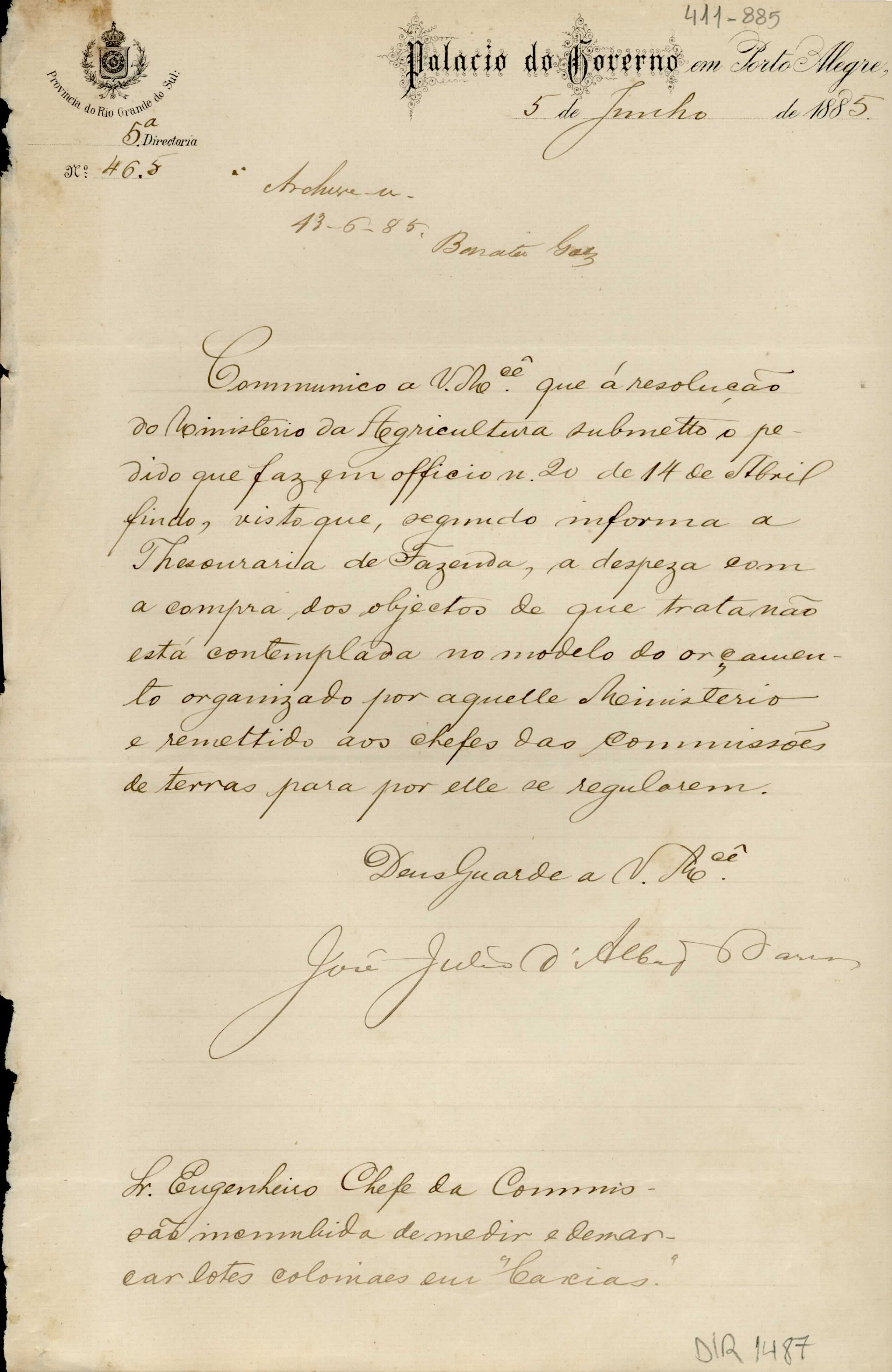 De José Julio de Albuquerque Barros - Palácio do Governo em Porto Alegre, 5ª Diretoria, para Manoel Barata Góes - Engenheiro Chefe da Comissão de Medição de Lotes em Caxias. Assunto: comunica que a despesa com os objetos solicitados em ofício, não está contemplada no orçamento organizado pelo Ministério da Agricultura. Local : Porto Alegre