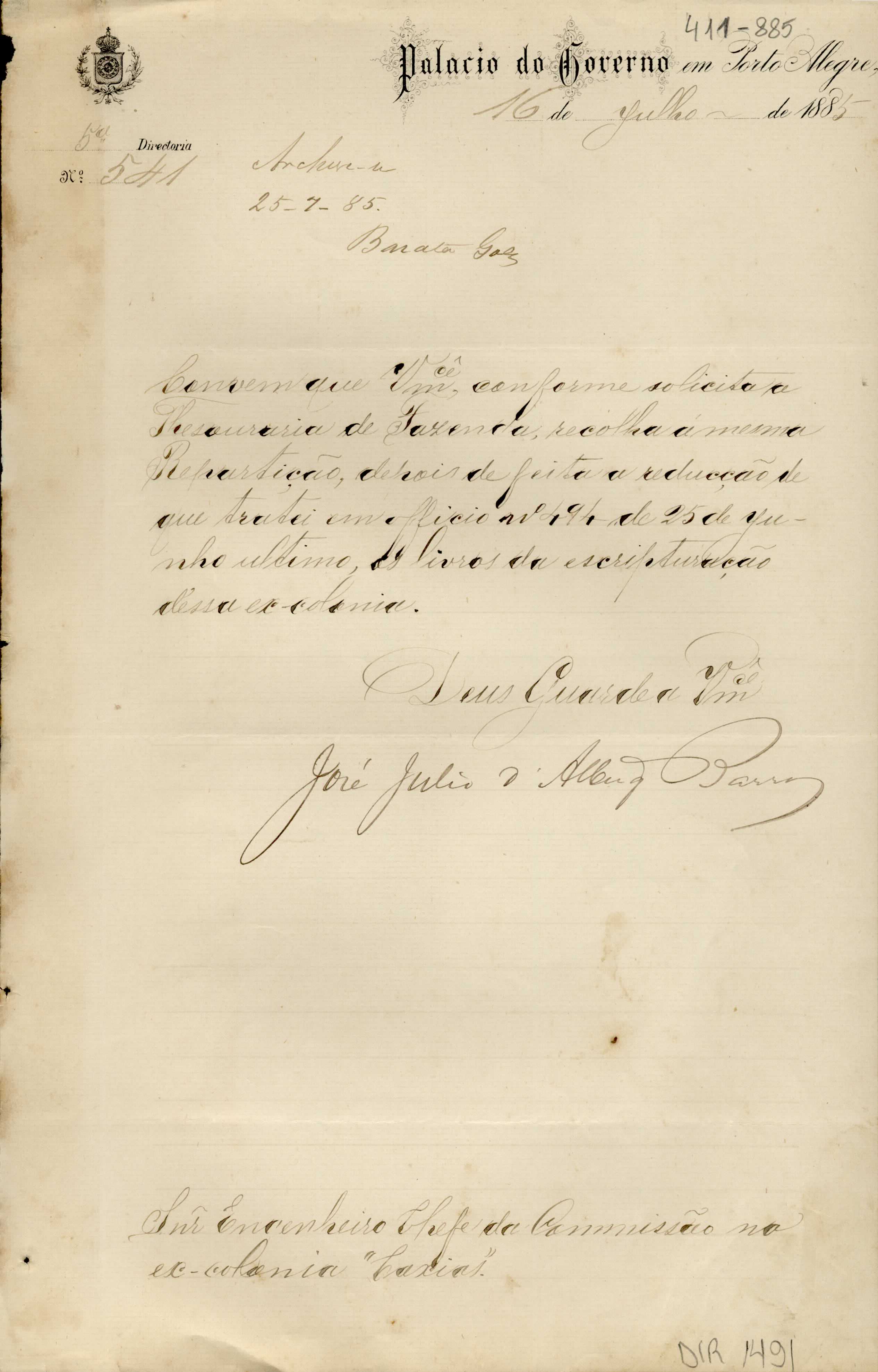 De José Julio de Albuquerque Barros - Palácio do Governo em Porto Alegre, 5ª Diretoria, para Manoel Barata Góes - Engenheiro Chefe da Comissão de Medição de Lotes em Caxias. Assunto: solicita o recolhimento à Tesouraria de Fazenda, dos livros de escrituração da ex-Colônia Caxias.