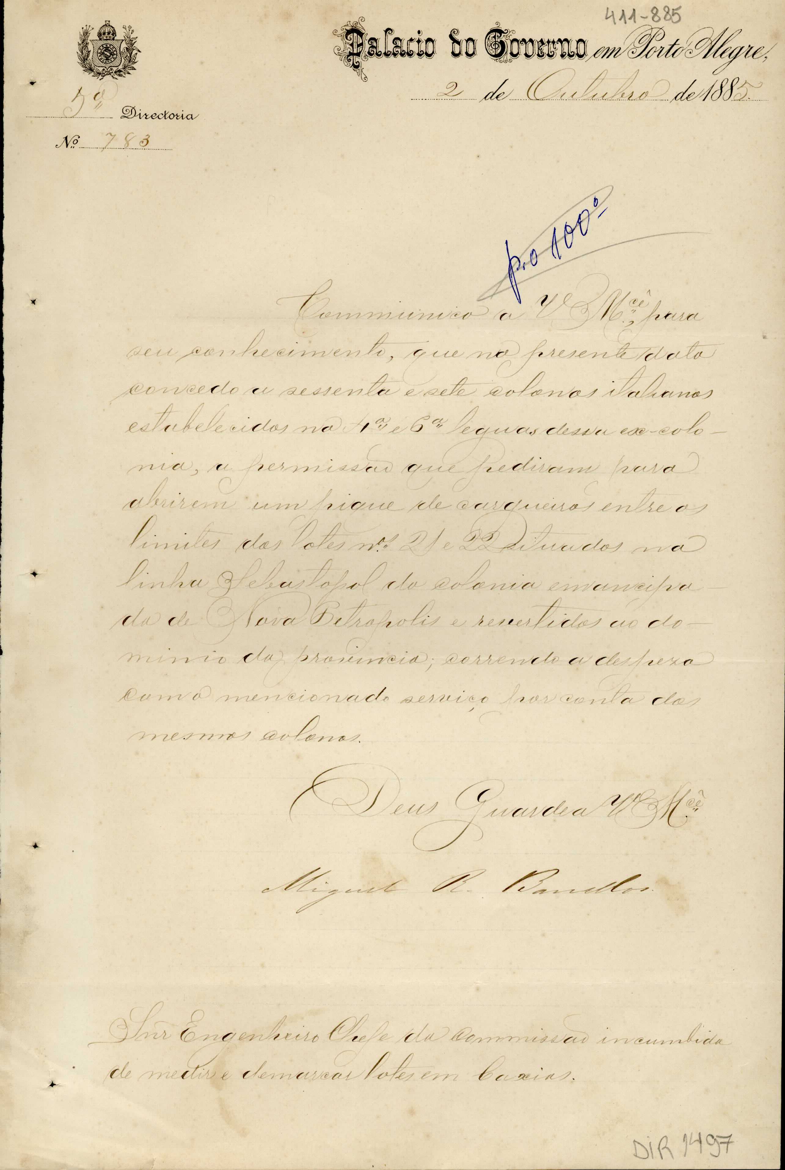 De Miguel R. Barcellos - Palácio do Governo em Porto Alegre, 5ª Diretoria, para Manoel Barata Góes - Engenheiro Chefe da Comissão de Medição de Lotes em Caxias. Assunto: comunica concessão a sessenta e sete colonos italianos da 4ª e 6ª léguas de Caxias, para abrir um pique de cargueiro em Nova Petrópolis, com a despesa por conta dos colonos. Local : Porto Alegre