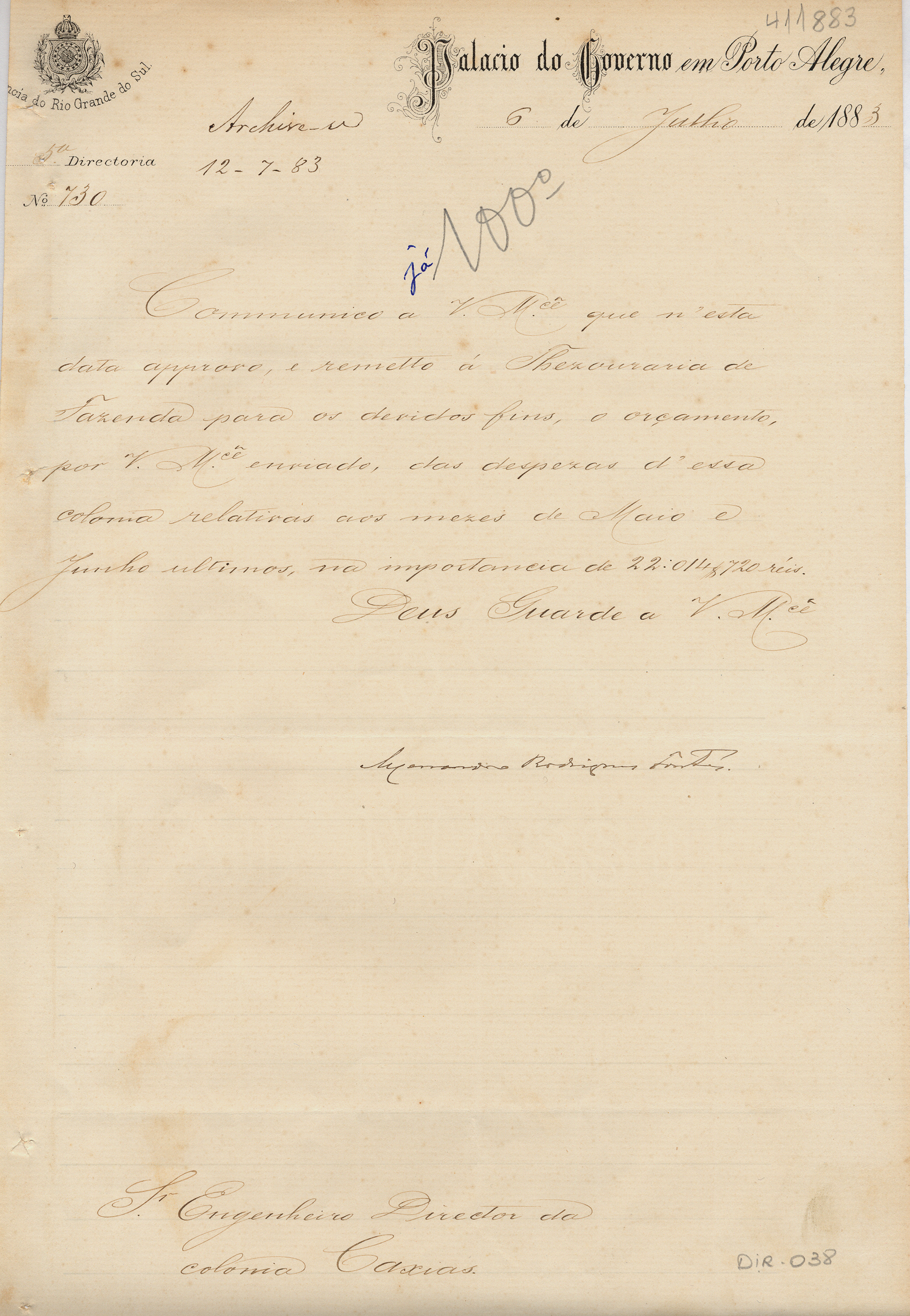 Do Palácio do Governo - 5ª Diretoria - Menandro Rodrigues Fontes, para o Engenheiro Diretor da Colônia Caxias. Assunto: comunica aprovação do orçamento das despesas da colônia (maio e junho). Local: Porto Alegre.