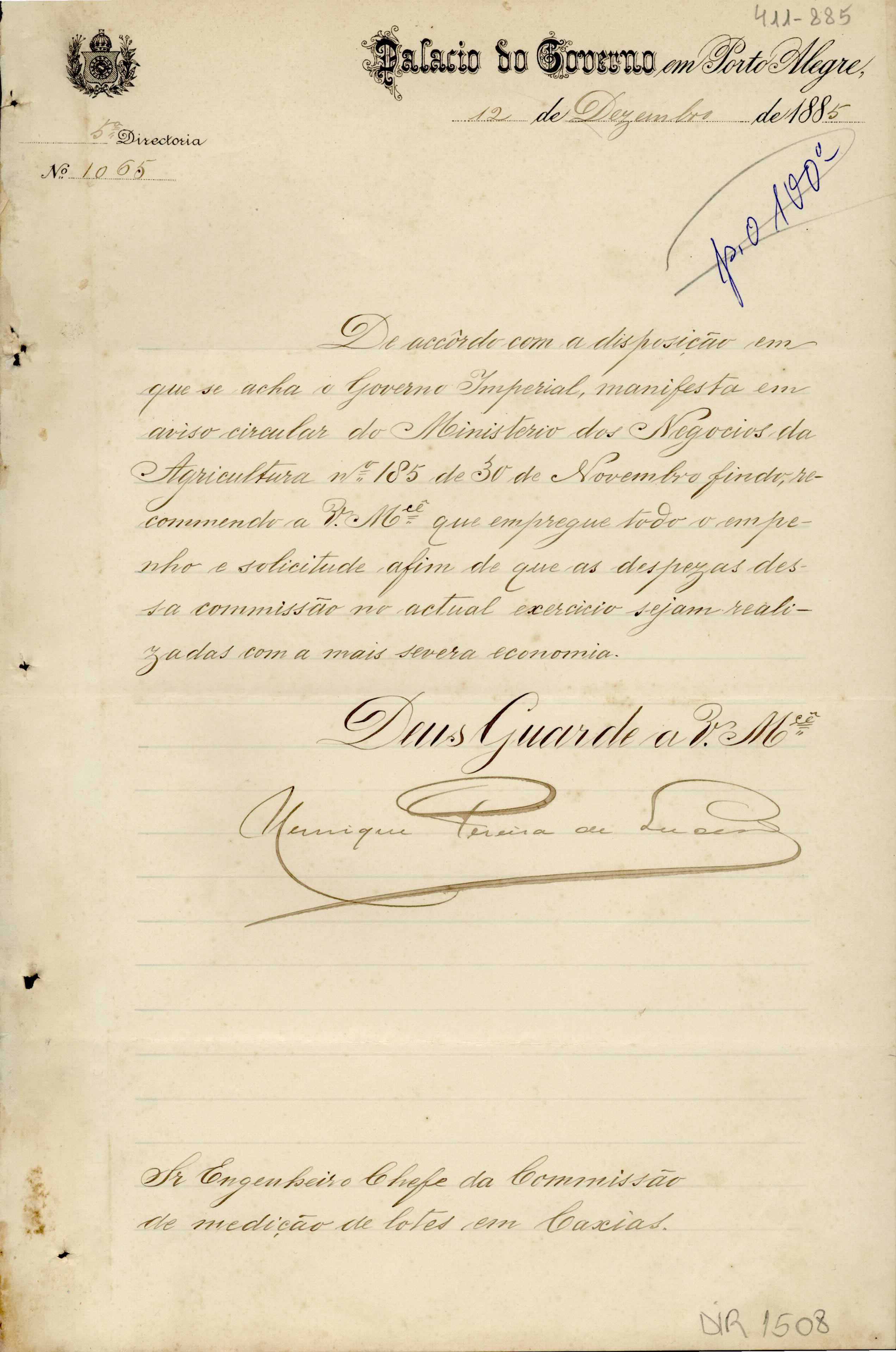 De Henrique Pereira de Lucena - Palácio do Governo em Porto Alegre, 5ª Diretoria, para Manoel Barata Góes - Engenheiro Chefe da Comissão de Medição de Lotes em Caxias. Assunto: recomenda economia com as despesas da Comissão, conforme aviso circular do Ministério dos Negócios da Agricultura.