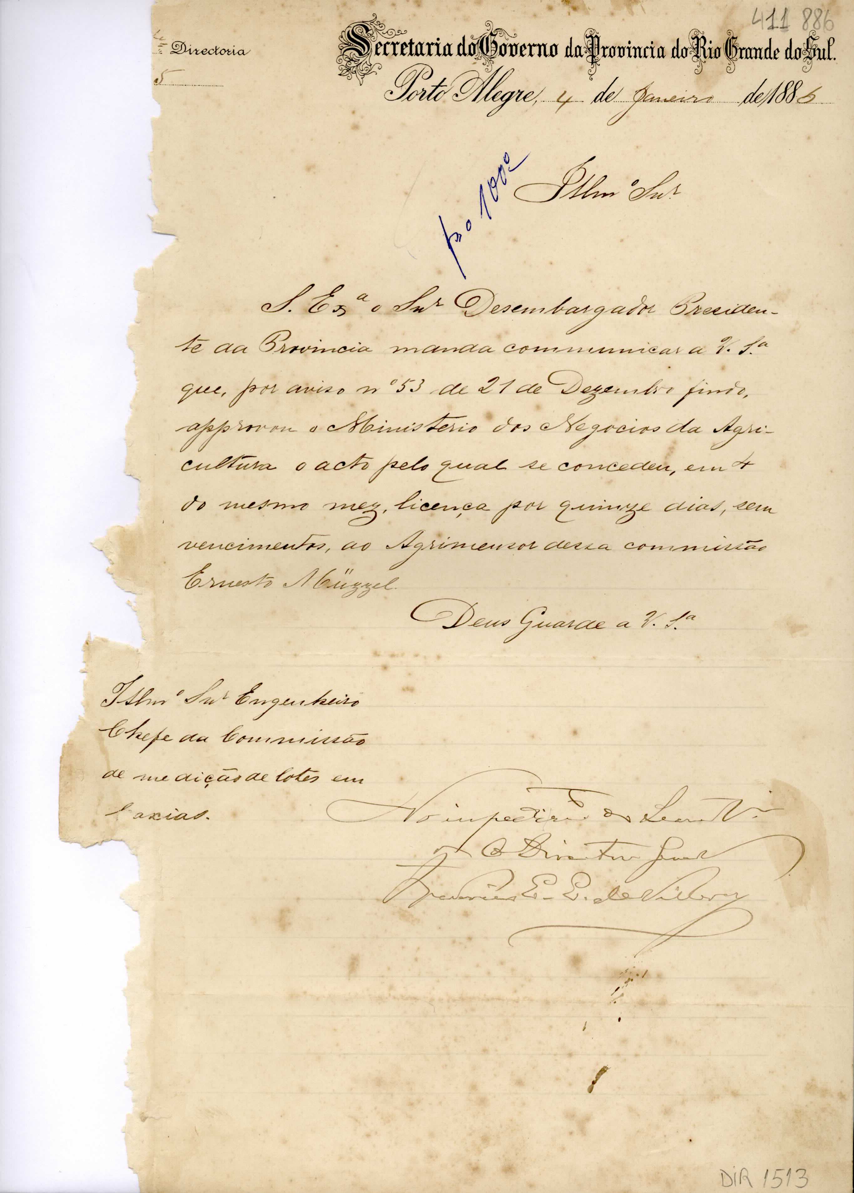 De Frederico E. E. de Villeroy - Diretor Geral da Secretaria do Governo da Província do Rio Grande do Sul em Porto Alegre, para Manoel Barata Góes - Eng. Chefe da Comissão de Medição de Lotes em Caxias. Assunto: comunica concessão de licença do Agrimensor da Comissão, Ernesto Müzzel. Local : Porto Alegre