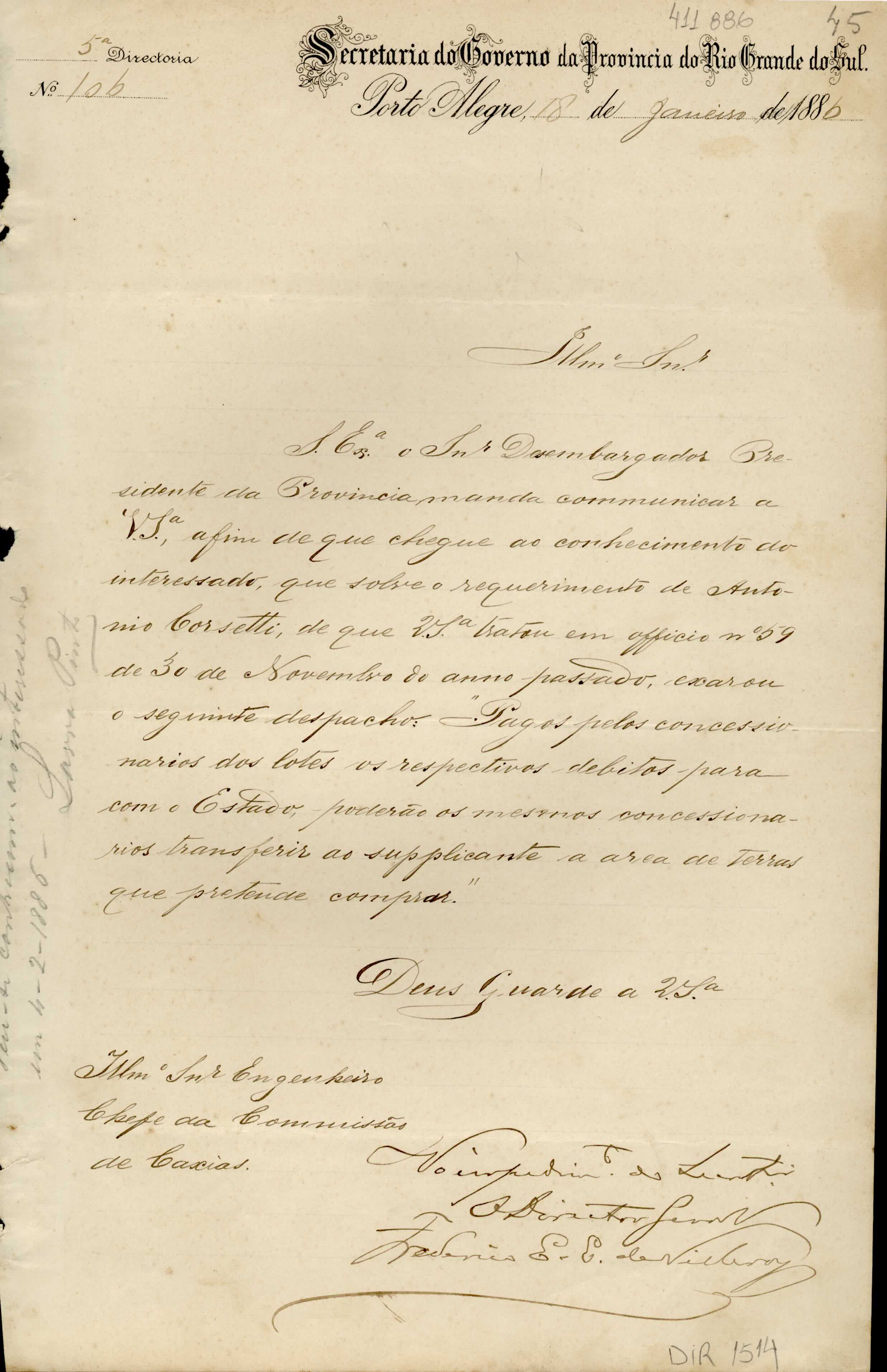 De Frederico E. E. de Villeroy - Diretor Geral da Secretaria do Governo da Província do Rio Grande do Sul em Porto Alegre, para Manoel Barata Góes - Eng. Chefe da Comissão de Medição de Lotes em Caxias. Assunto: informa sobre o requerimento de Antonio Corsetti, a respeito de compra de terras. Local: Porto Alegre