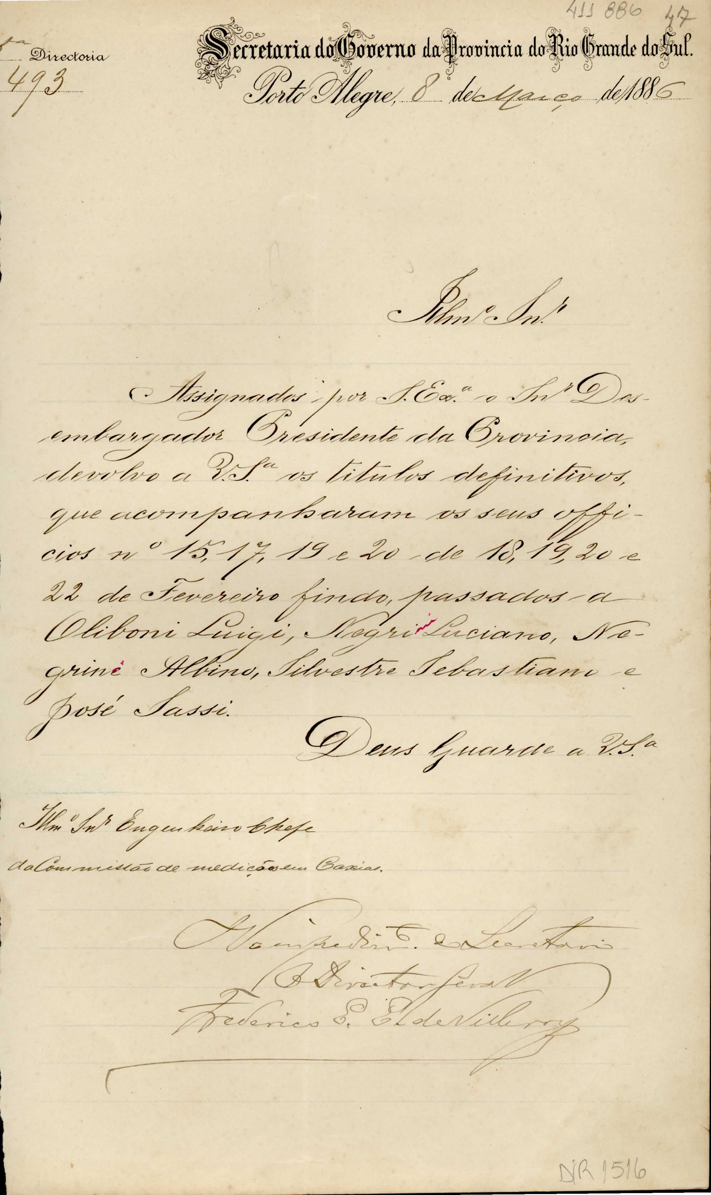 De Frederico E. E. de Villeroy - Diretor Geral da Secretaria do Governo da Província do Rio Grande do Sul em Porto Alegre, para Manoel Barata Góes - Eng. Chefe da Comissão de Medição de Lotes em Caxias. Assunto: comunica devolução dos títulos definitivos, passados a Oliboni Luigi, Negrini Luciano, Negrini Albino, Silvestre Sebastiano e José Sassi. Local : Porto Alegre