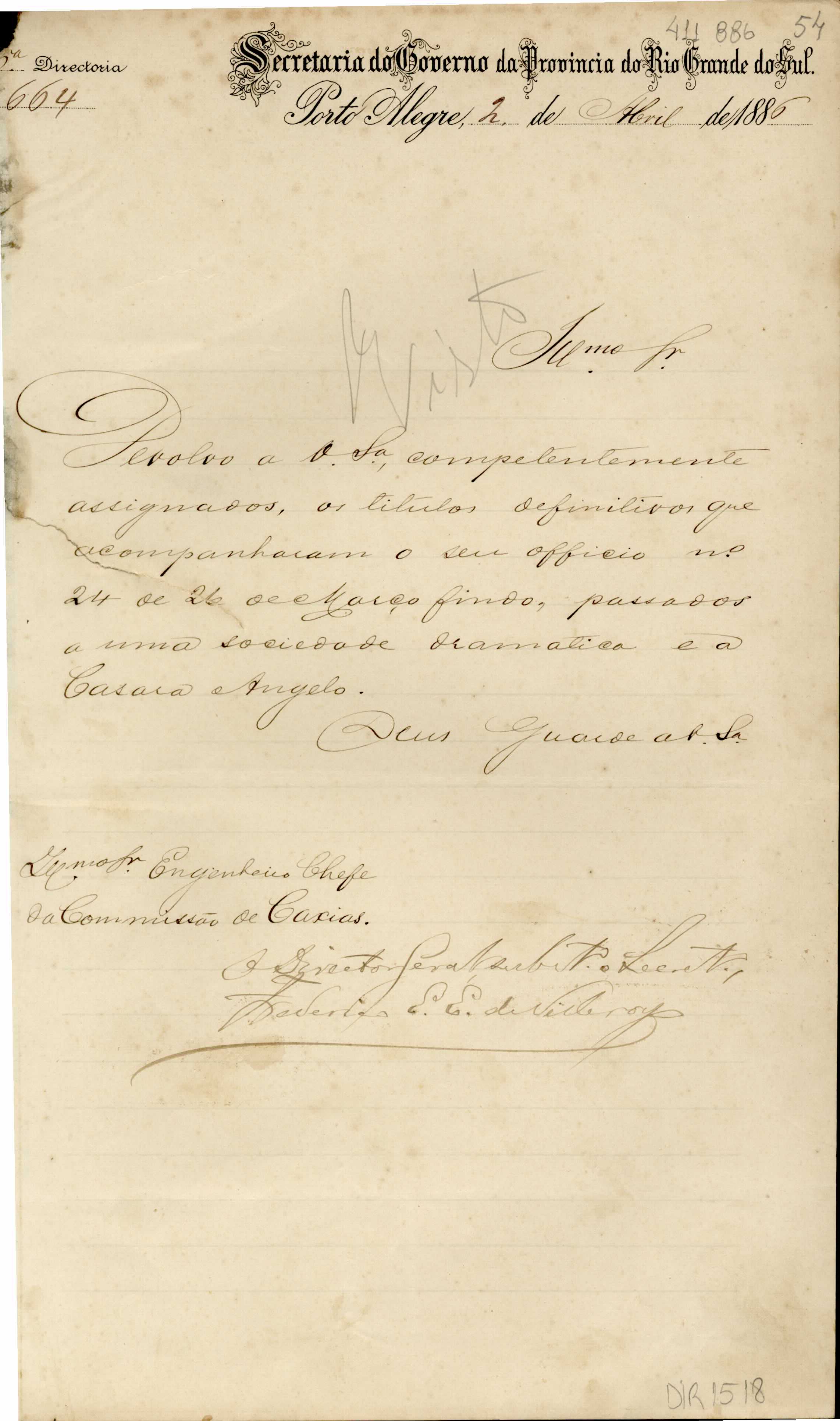 De Frederico E. E. de Villeroy - Diretor Geral da Secretaria do Governo da Província do Rio Grande do Sul em Porto Alegre, para Manoel Barata Góes - Eng. Chefe da Comissão de Medição de Lotes em Caxias. Assunto: comunica devolução de títulos definitivos assinados, passados a uma sociedade dramática e a Casara Angelo. Local: Porto Alegre