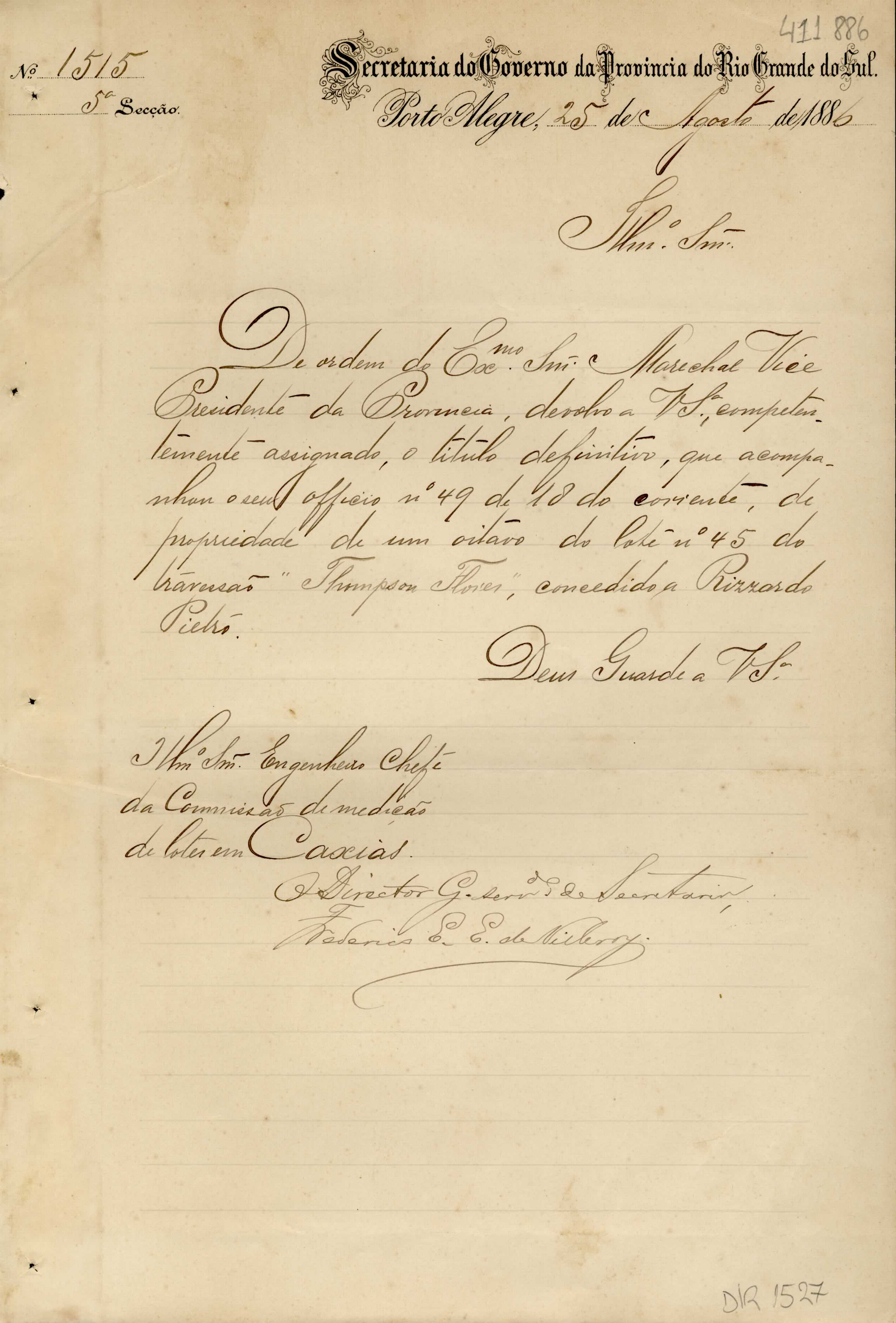 De Frederico E. E. de Villeroy - Diretor Geral da Secretaria do Governo da Província do Rio Grande do Sul em Porto Alegre, para Manoel Barata Góes - Eng. Chefe da Comissão de Medição de Lotes em Caxias. Assunto: comunica devolução de título definitivo assinado, de propriedade de 1/8 do lote nº 45, travessão Thompson Flores, concedido a Rizzardo Pietro. Local : Porto Alegre