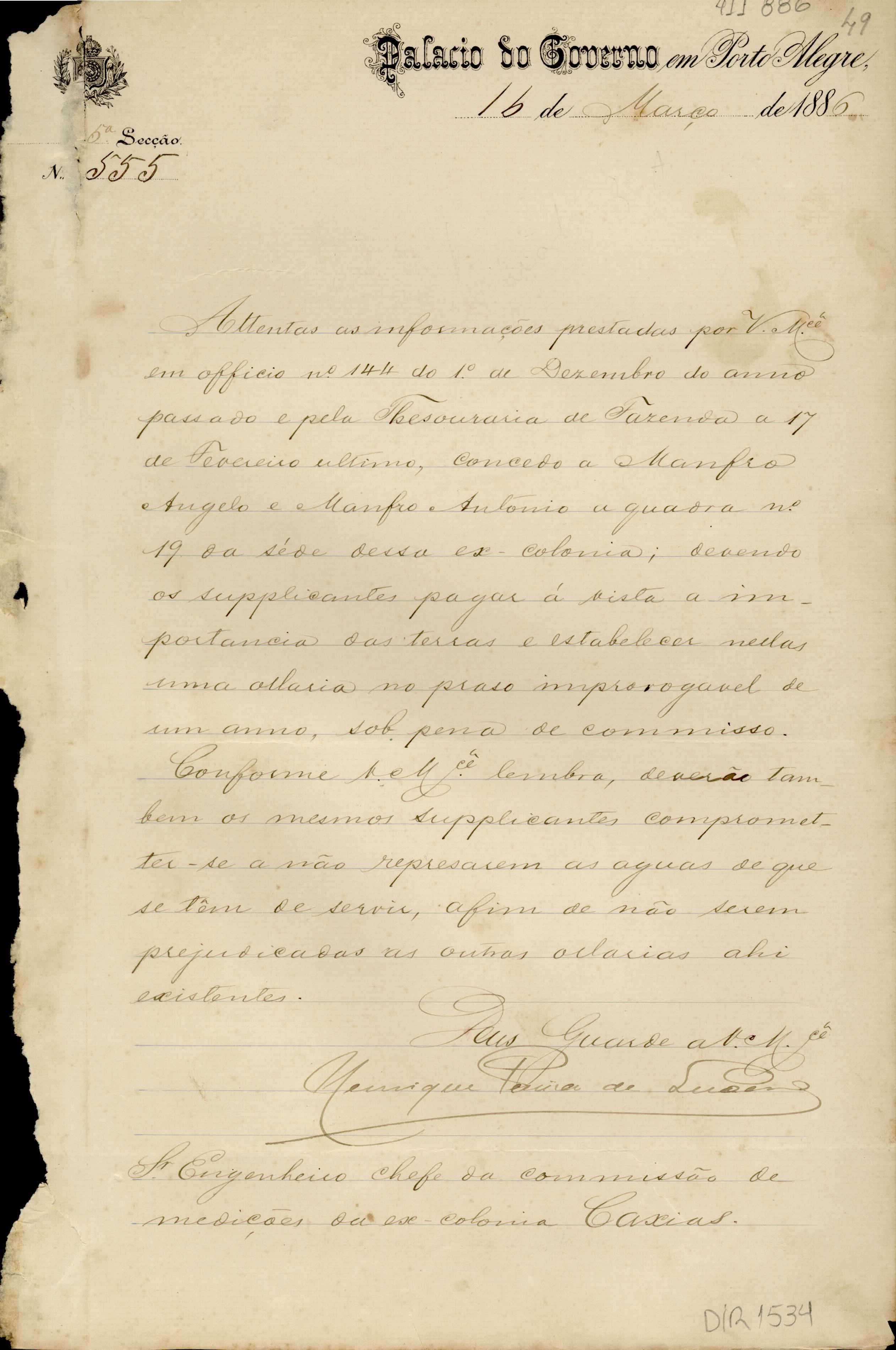 De Henrique Pereira de Lucena - Palácio do Governo em Porto Alegre, 5ª Seção, para Manoel Barata Góes - Engenheiro Chefe da Comissão de Medição de Lotes em Caxias. Assunto: comunica concessão da quadra nº 19 de Caxias, a Manfro Angelo e Manfro Antonio, para estabelecimento de olaria / solicita que não represem as águas. Local: Porto Alegre