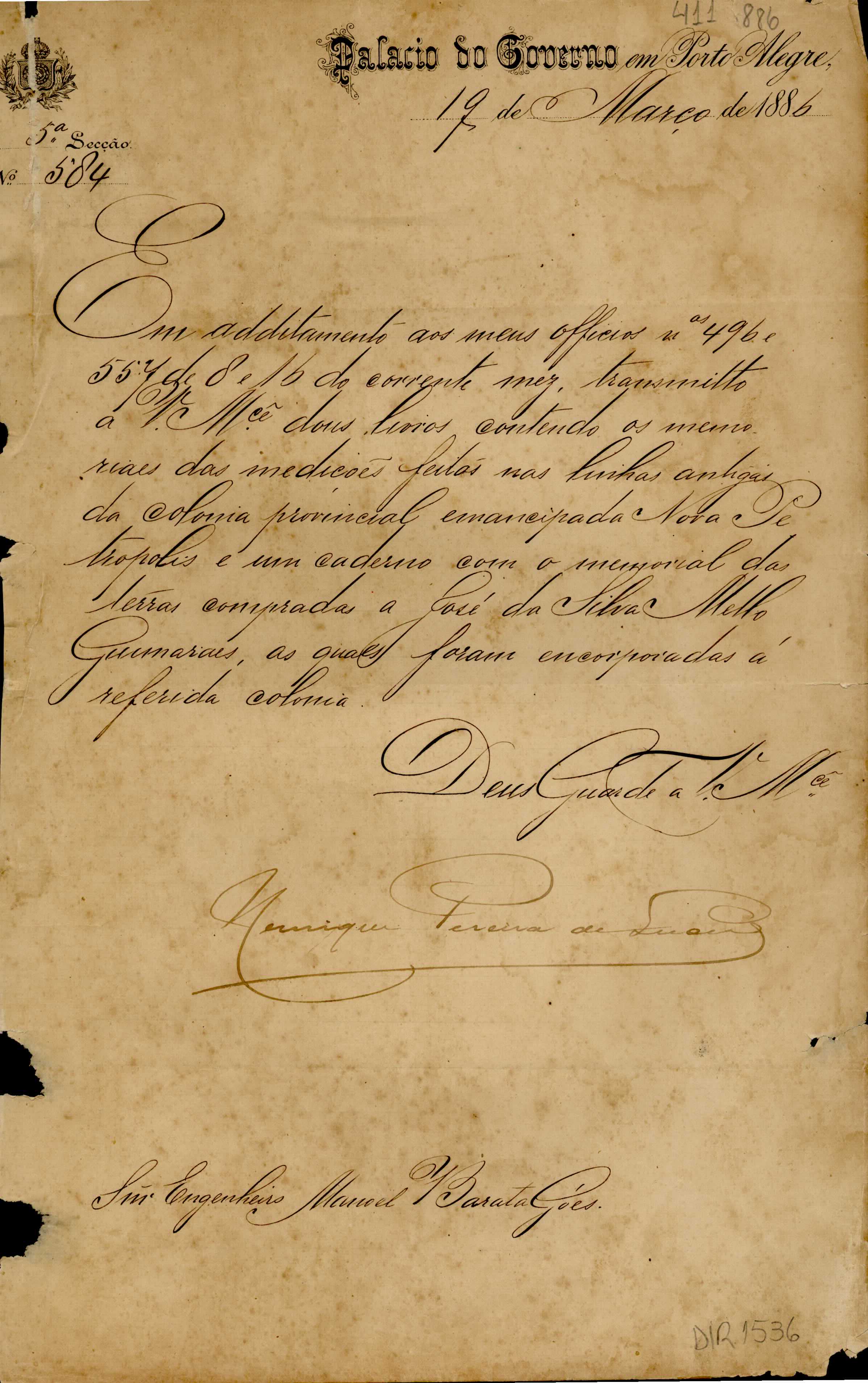 De Henrique Pereira de Lucena - Palácio do Governo em Porto Alegre, 5ª Seção, para Manoel Barata Góes - Engenheiro Chefe da Comissão de Medição de Lotes em Caxias. Assunto: comunica transmissão de dois livros contendo os memoriais das medições feitas em Nova Petrópolis e o memorial das terras compradas de José da Silva Mello Guimarães. Local : Porto Alegre